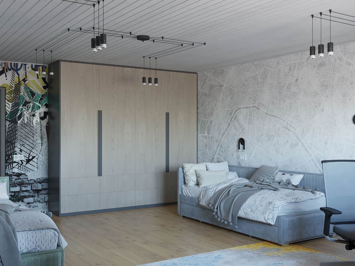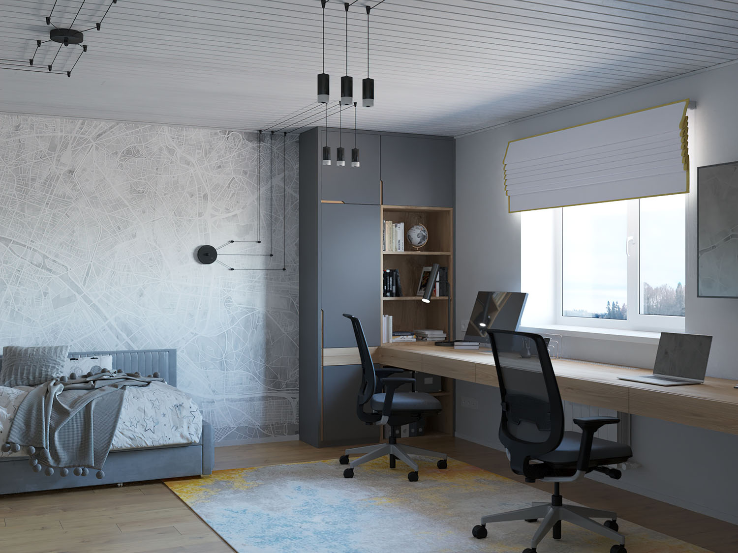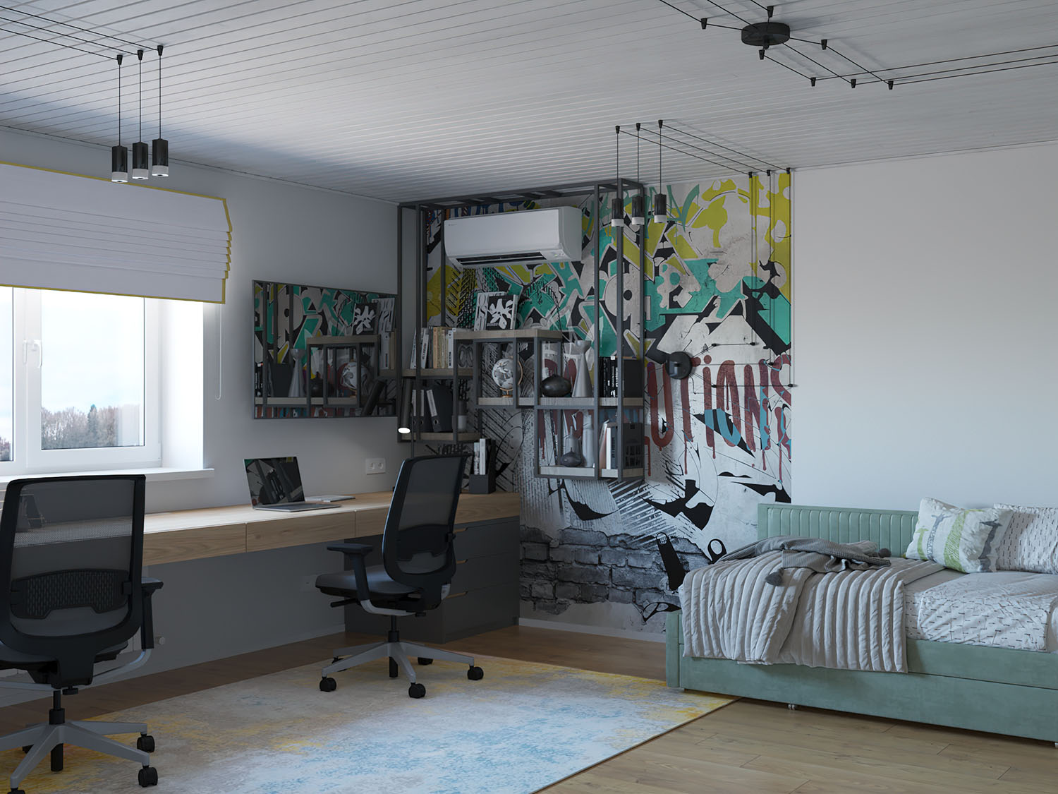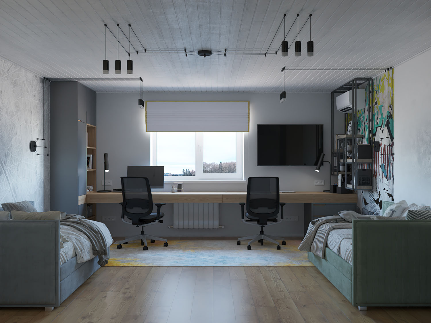 Уютная и комфортная комната в частном доме для двух тинэйджеров площадью 27 м², г. Уфа. Дизайн подростковой комнаты в первую очередь должен быть направлен на определение расположения трех основных и необходимых зон: учебную, для отдыха и для досуга. Каким бы маленьким ни было помещение, но эти три так называемых кита должны обязательно присутствовать.