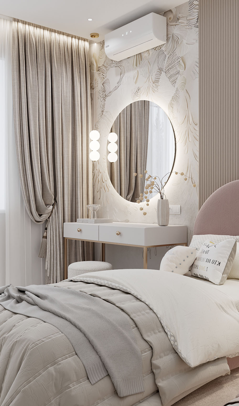 Двухэтажный дом находится в городе Тюмень. У главы семейства было пожелание — сделать эстетичные пространства, которые по мере взросления девочек не потеряют актуальность. И бонусом — одна комната должна была быть в любых цветах, кроме розового! На площадях 18 м² расположились две детские со спальными местами, а также игровая, площадью 16 м².