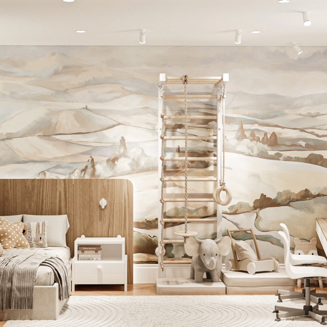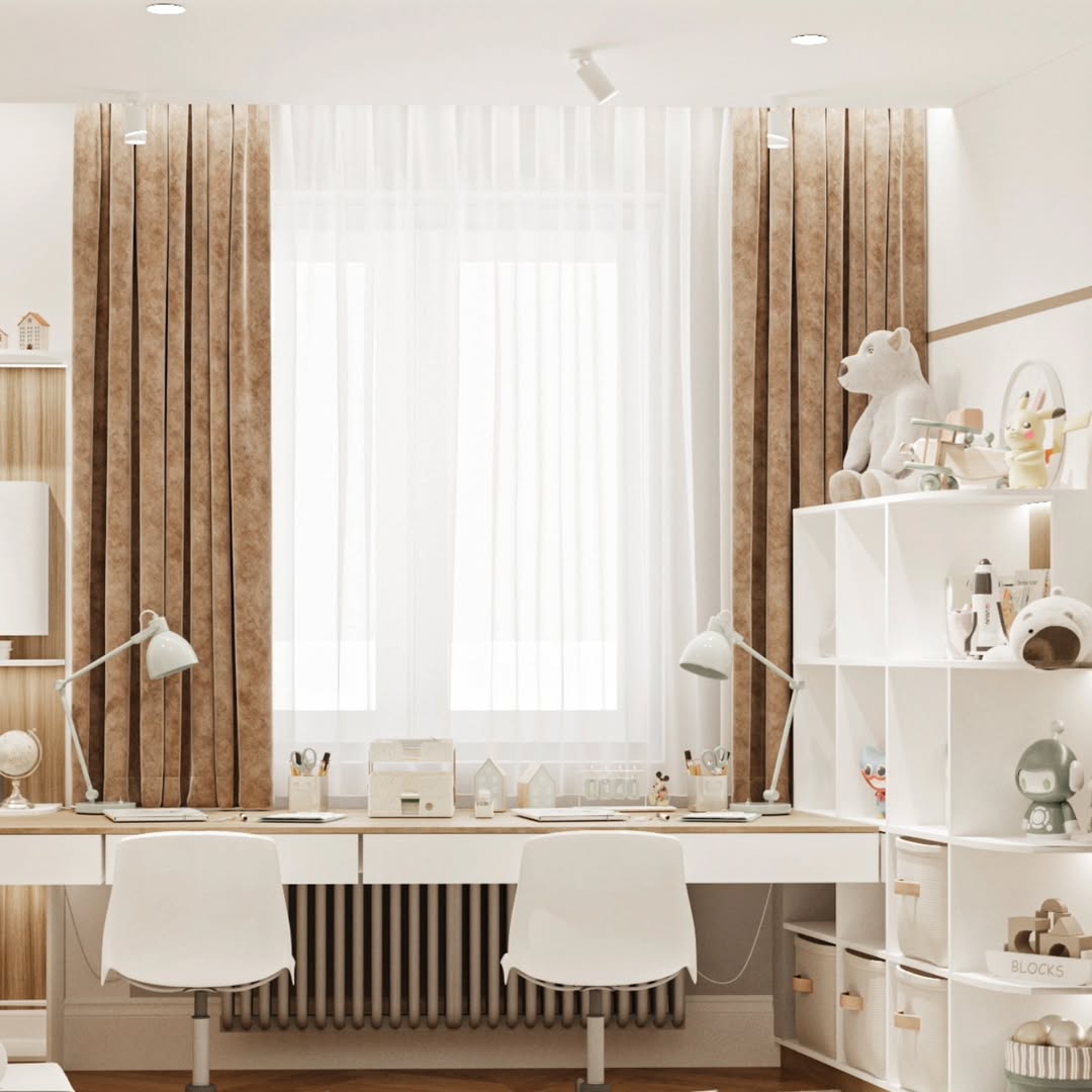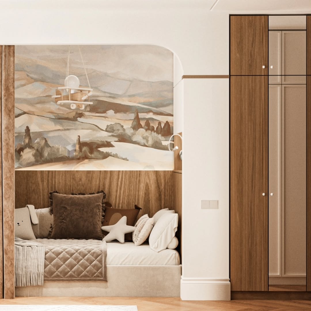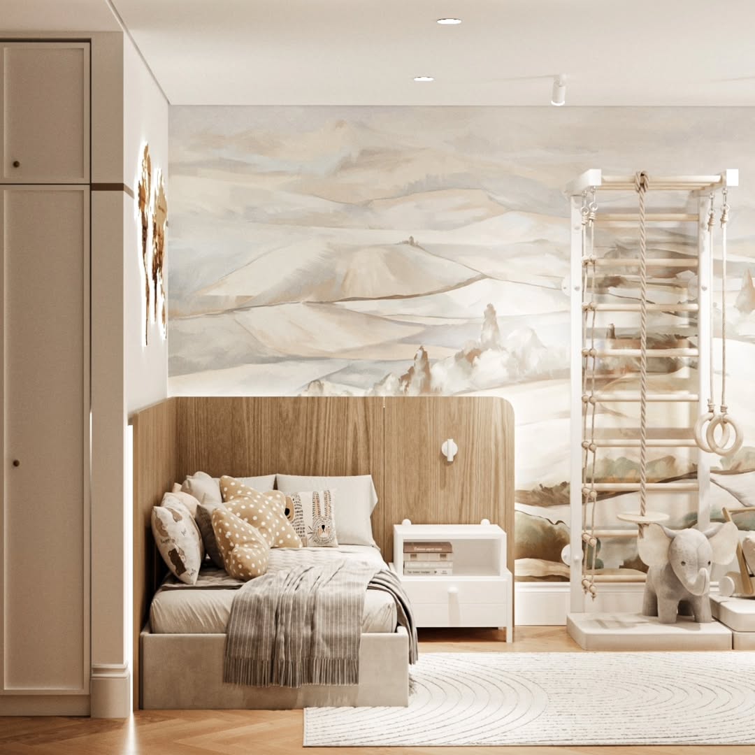 Дизайн-проект детской комнаты площадью 20 м² в ЖК Авалон сити, г. Казань. Заказчики — молодая супружеская пара с двумя замечательными детьми, для которых и был создан этот проект. Основными пожеланиями заказчиков были бежевые, почти белые стены с акцентом - фреска, арт или граффити, с возможностью ухода за стенами.