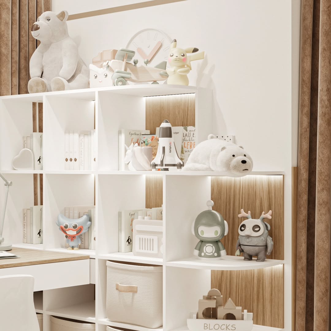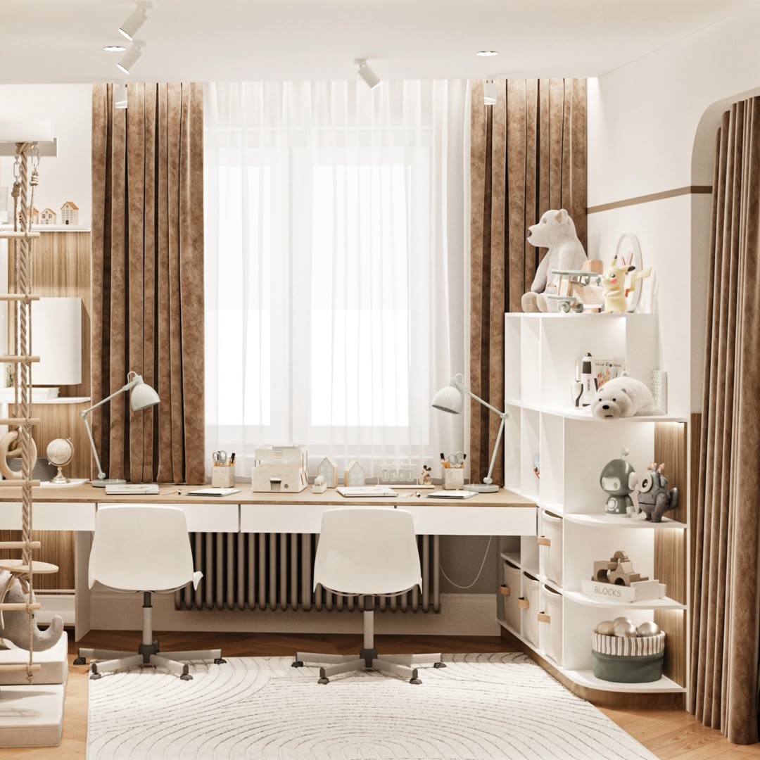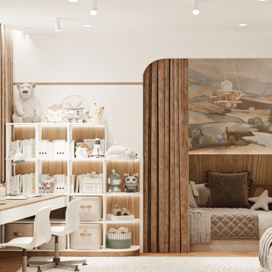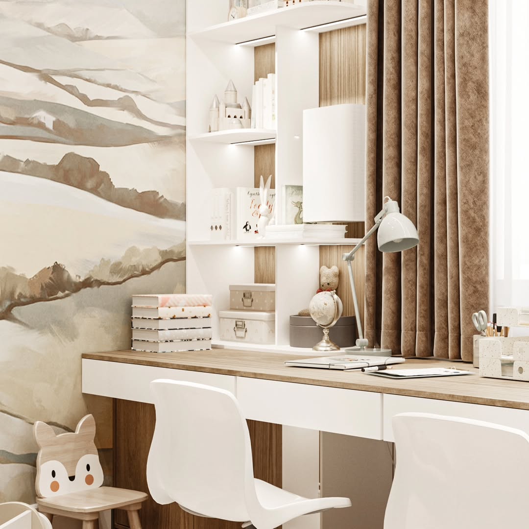 Дизайн-проект детской комнаты площадью 20 м² в ЖК Авалон сити, г. Казань. Заказчики — молодая супружеская пара с двумя замечательными детьми, для которых и был создан этот проект. Основными пожеланиями заказчиков были бежевые, почти белые стены с акцентом - фреска, арт или граффити, с возможностью ухода за стенами.