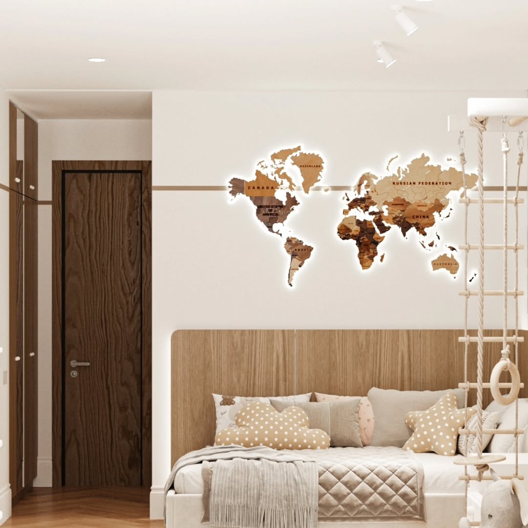 По наполнению: большой рабочий стол, открытое хранение, шведская стенка, карта мира с подсветкой на стене и арки.