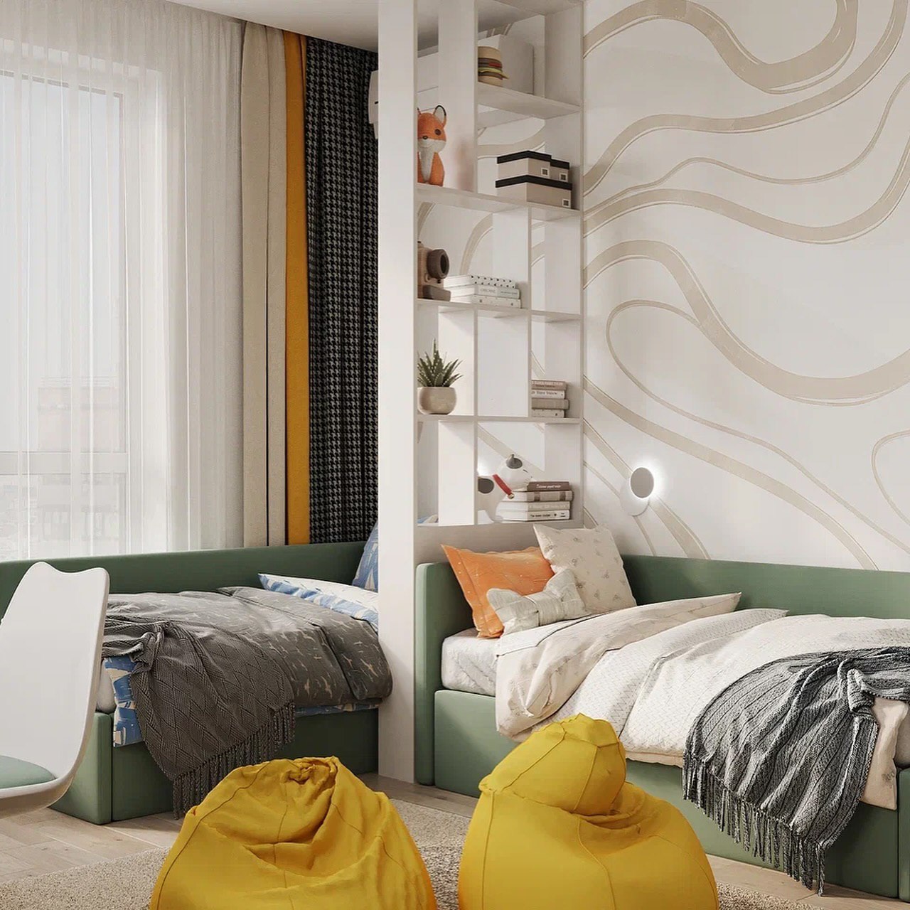 Здесь расположили кровати буквой «Г» изголовьями друг к другу и отделили