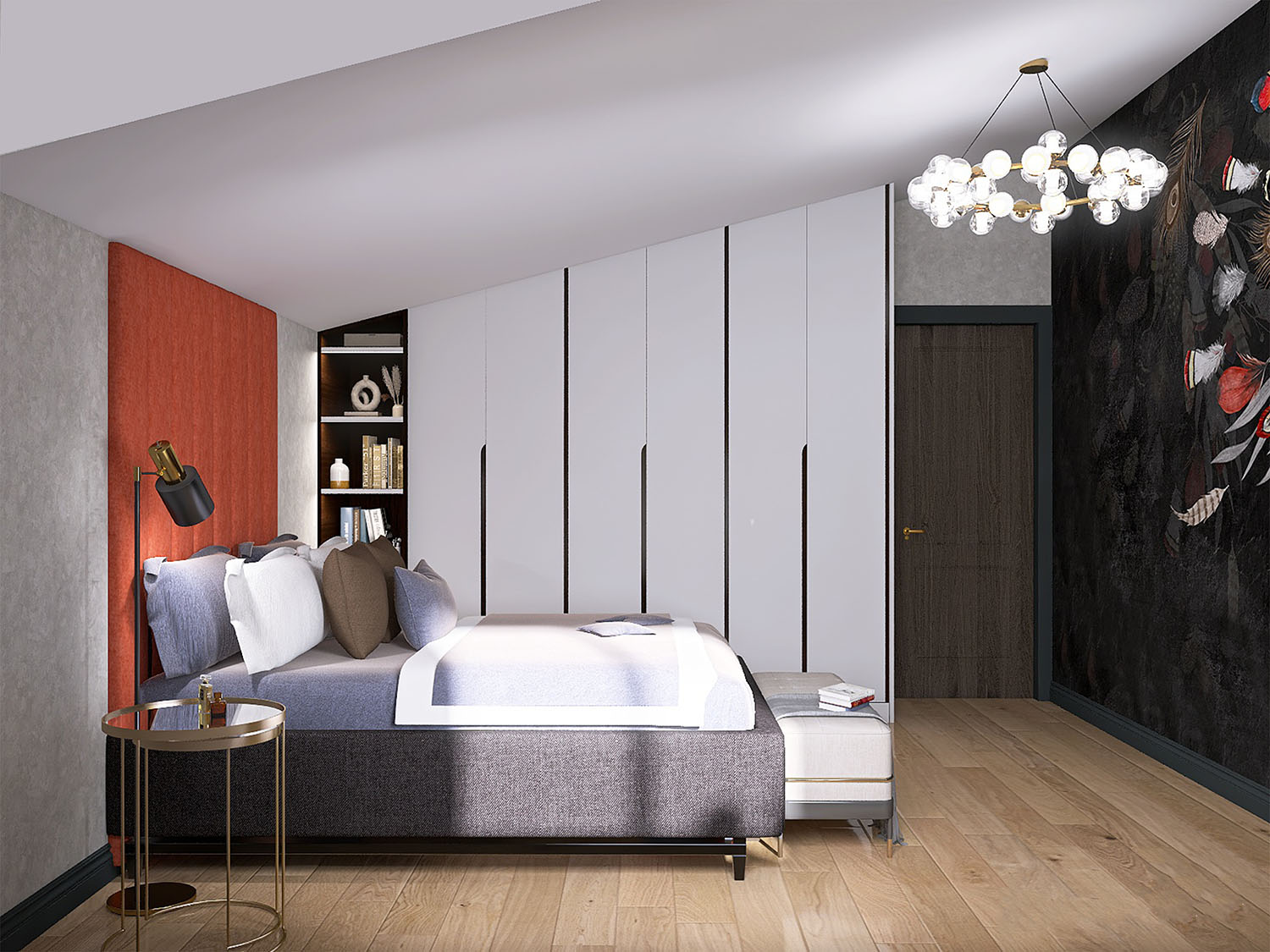 Для выполнения этой задачи на акцентной стене решили разместить необычные обои из коллекции PERO. Остальной дизайн как бы дополняет эту фреску: это и изголовье кровати в терракотовом оттенке, которое является доминантой в комнате, и текстиль в фиалково-серых и бежевых тонах, и письменный стол со столешницей из натурального шпона, и люстра с золотисто-бронзовой отделкой и прозрачными шарами.