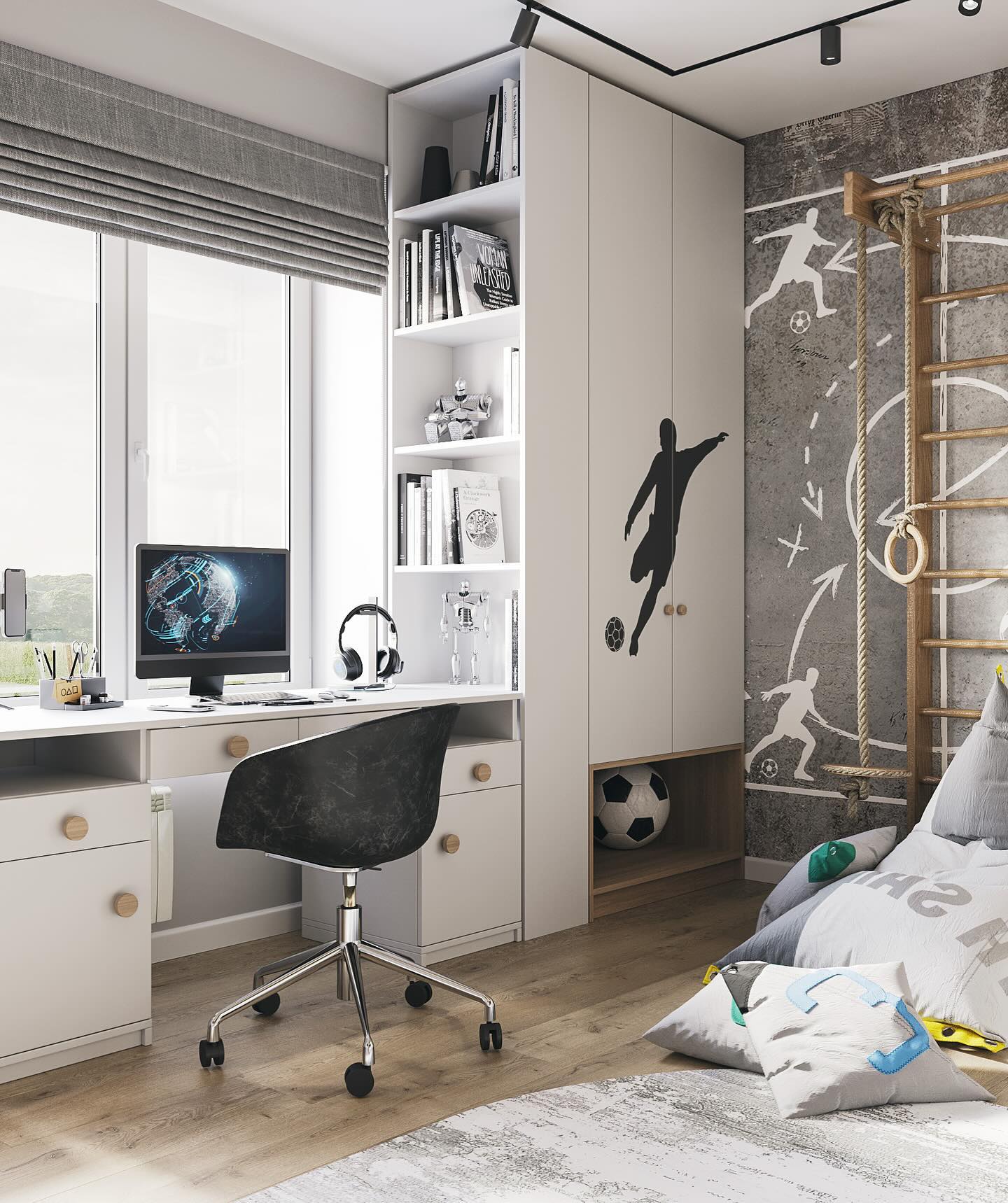 Детская для мальчика в проекте дома в г. Наро-Фоминск. Компьютерные игры, машины, футбол – то, что придется по вкусу мятежному подростку. Поэтому обои PODROST идеально подойдут, чтобы отразить бунтарскую натуру тинейджера.