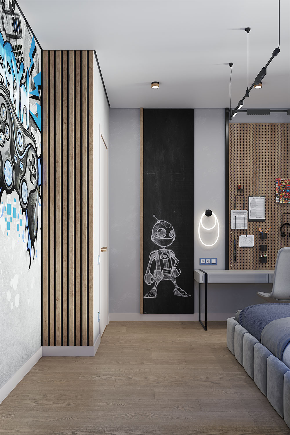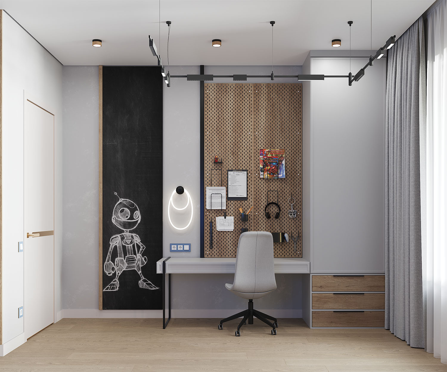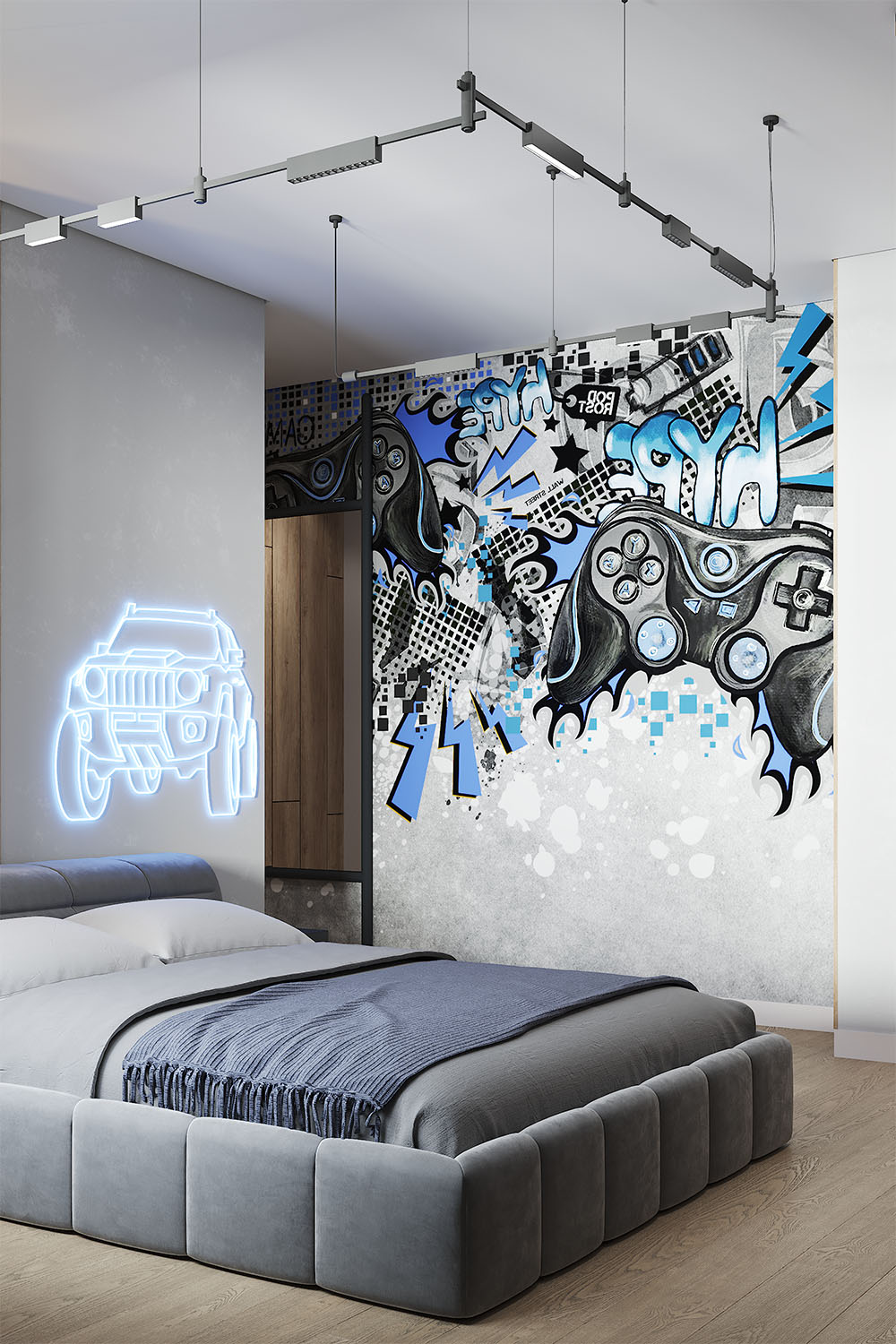 Детская комната для мальчика 5 лет с очень озорным и твердым характером. Он участвовал в проектировании, и достаточно успешно. Не хотелось слишком яркую комнату, но и монохром для деткой не совсем подходил. Решили использовать базовые цвета: серый и белый, к ним добавили натуральное дерево, черные подвесные треки — как в гараже у настоящих мужчин, неоновый светильник в форме джипа. И центром всей этой истории стали яркие, амбициозные, взрывные обои из коллекции PODROST! Этот принт как нельзя лучше вписался в комнату и превратил ее в стильное мальчишеское пространство, которое будет актуально на протяжении всех школьных лет, добавил красок и веселья. В тон обоев подобрали текстиль — и комната стала органичной, завершенной и яркой.