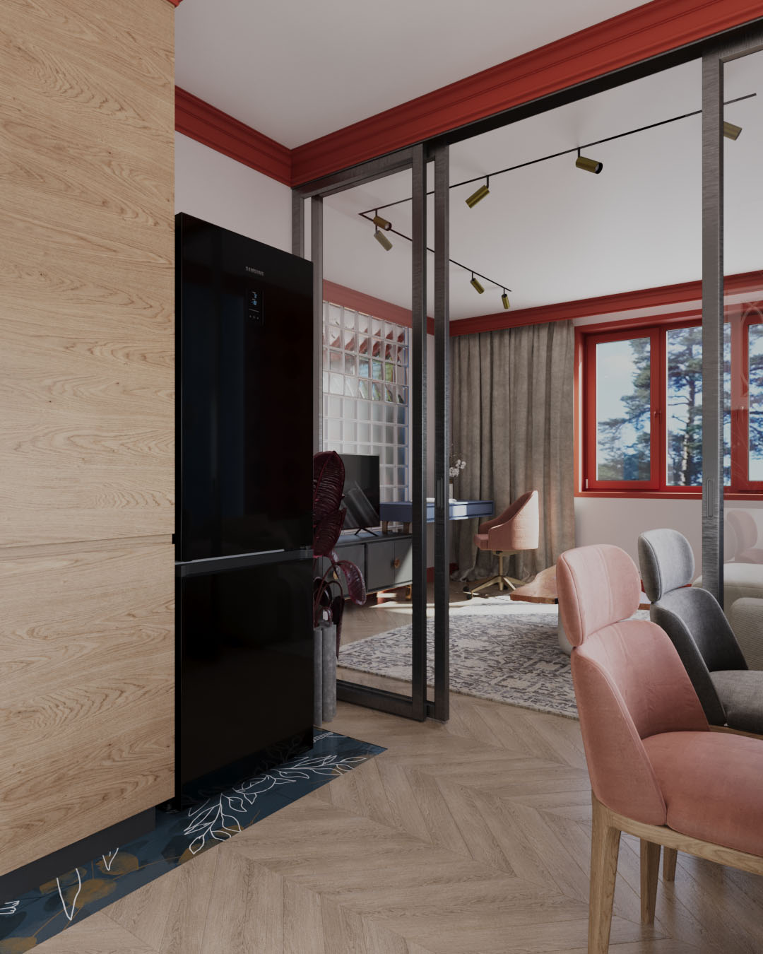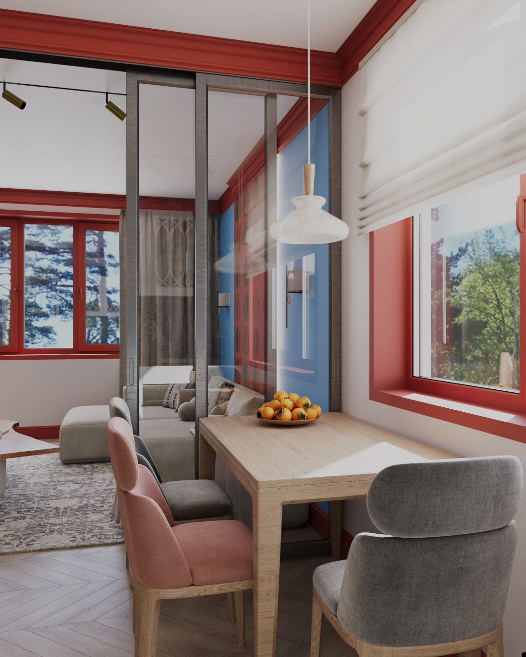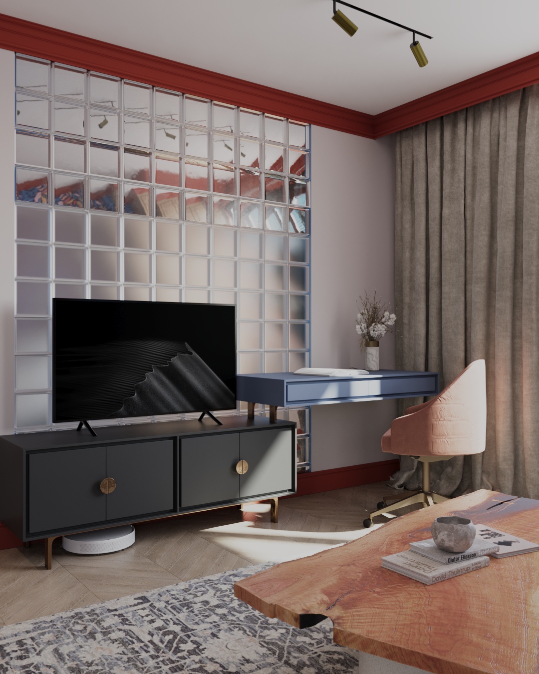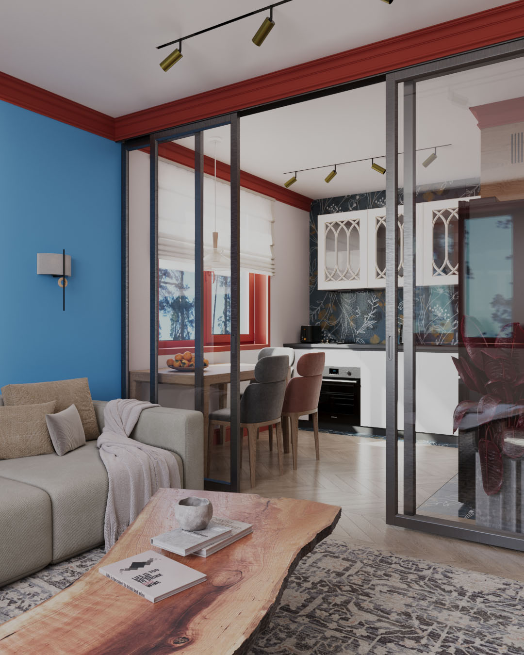 Дизайн с яркими цветами и акцентами — не для каждого. История со стеклоблочной перегородкой добавляет глубины, света и интереса. А яркие обои отлично подошли для поддержания «русского» стиля в этом интерьере.