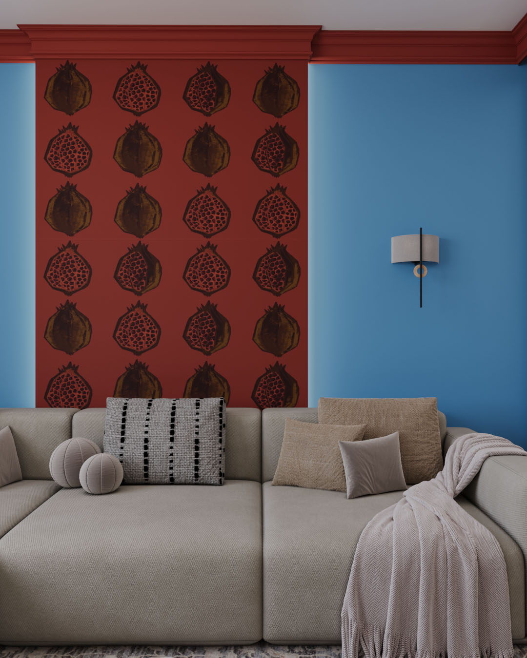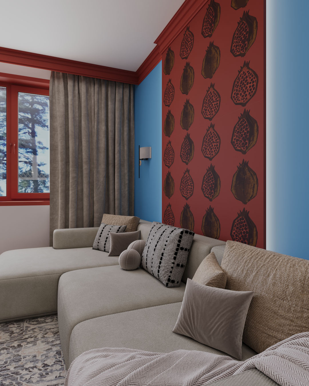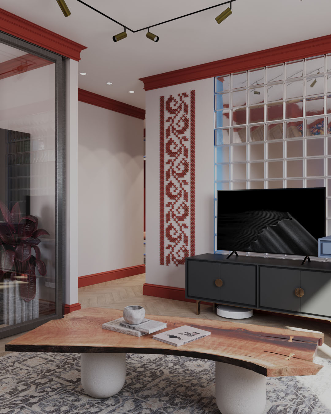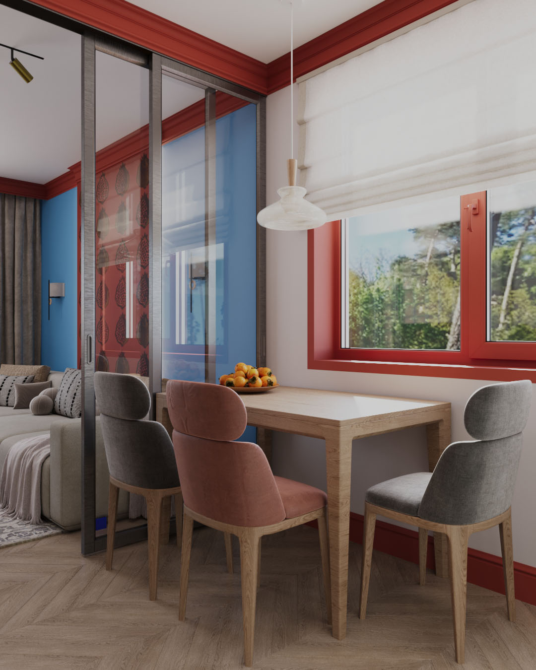 Дизайн с яркими цветами и акцентами — не для каждого. История со стеклоблочной перегородкой добавляет глубины, света и интереса. А яркие обои отлично подошли для поддержания «русского» стиля в этом интерьере.