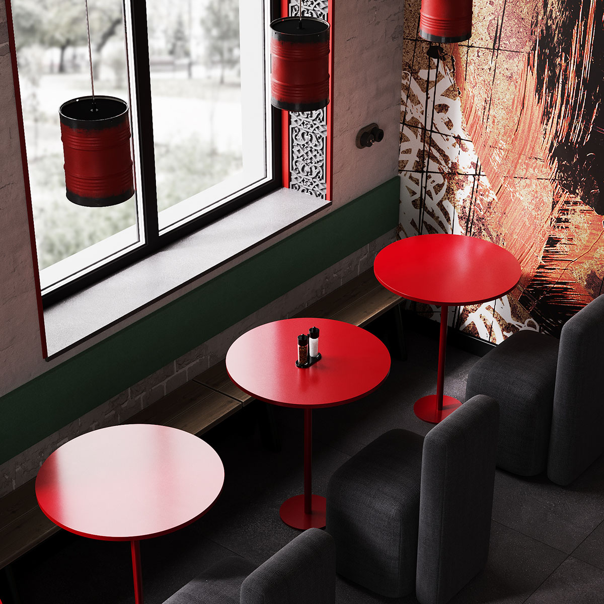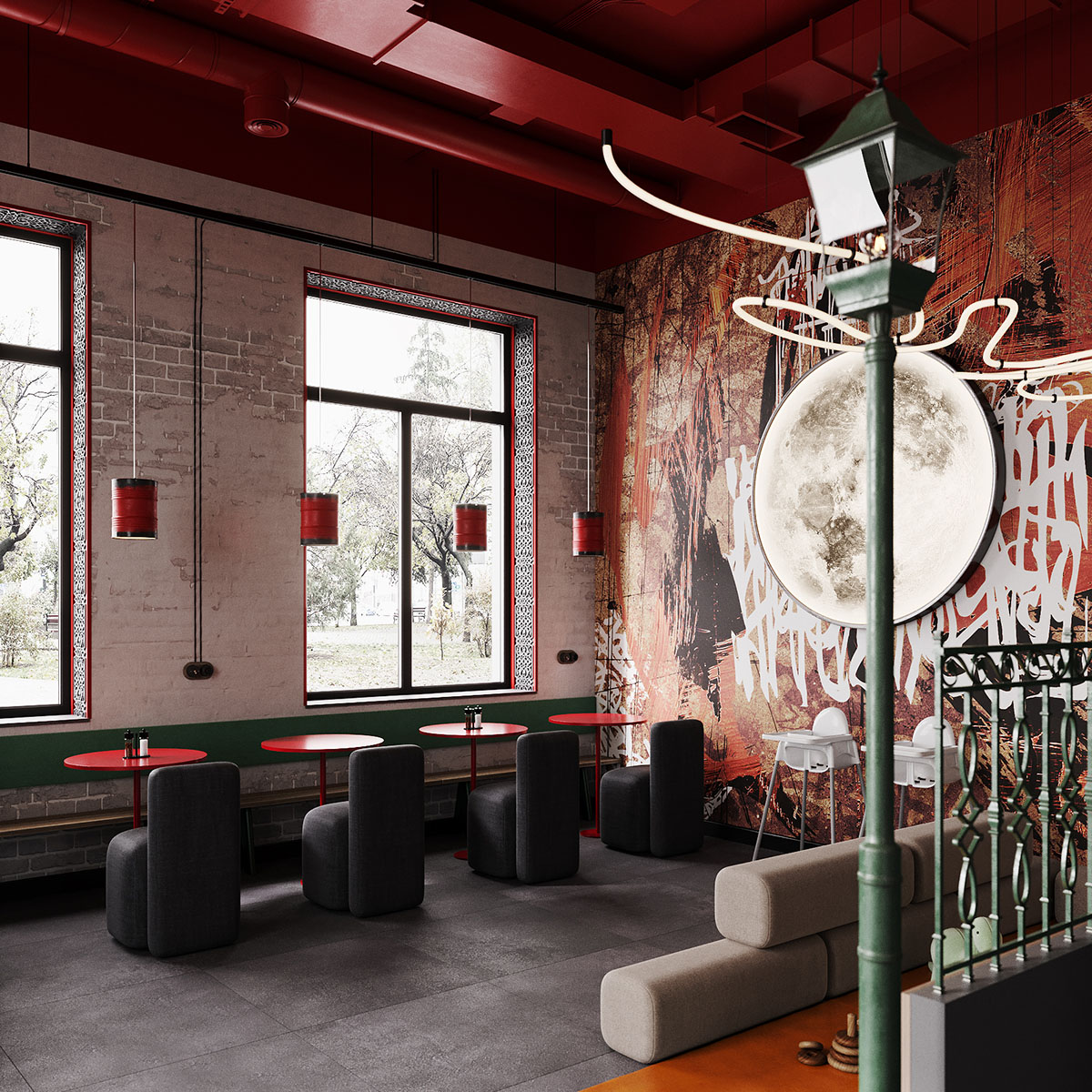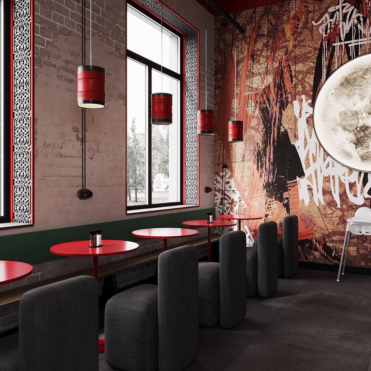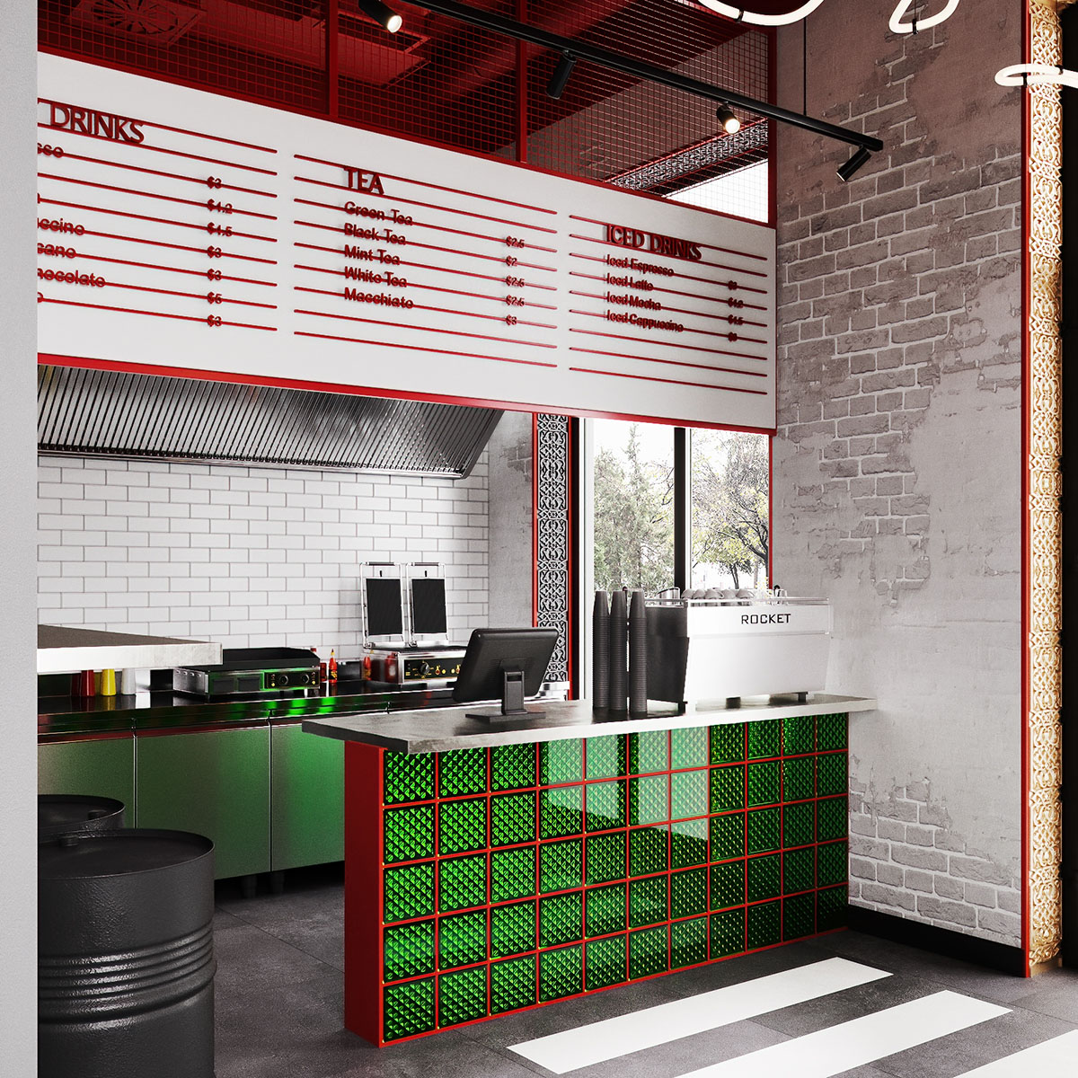 Проект ресторана, для оформления которого выбрали обои из коллекции THE SECRET LANGUAGE. Сеть стритфудов Шавармье, Москва. Концепция культуры улиц с лёгким арабским акцентом, ведь шеф-повар араб. Можно было бы заказать граффити, но так как это сеть, то акцентная стена должна быть повторяемой и узнаваемой.