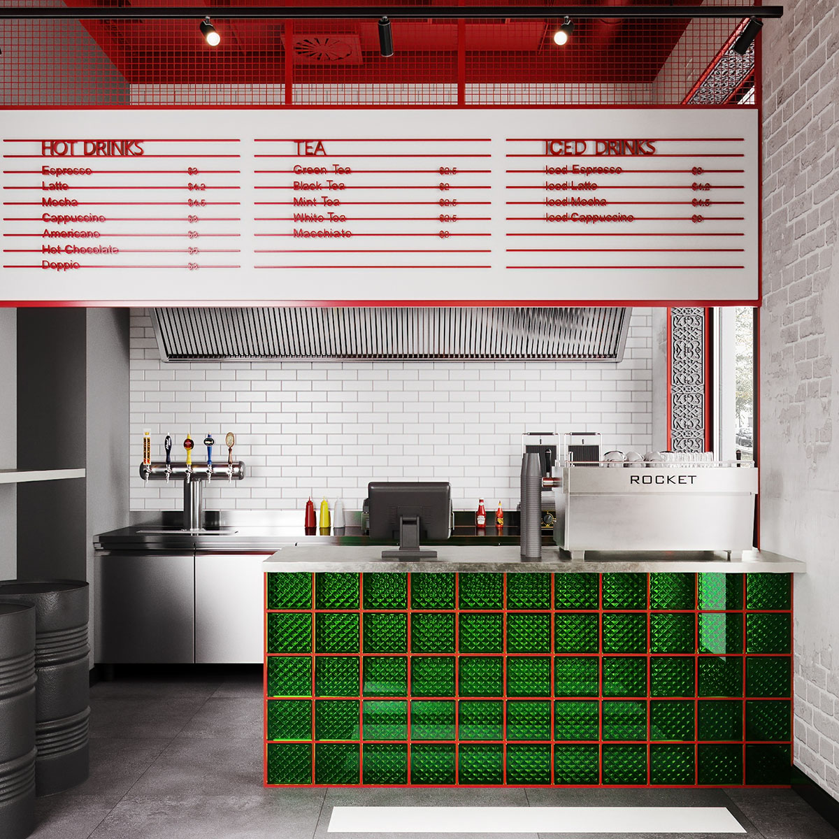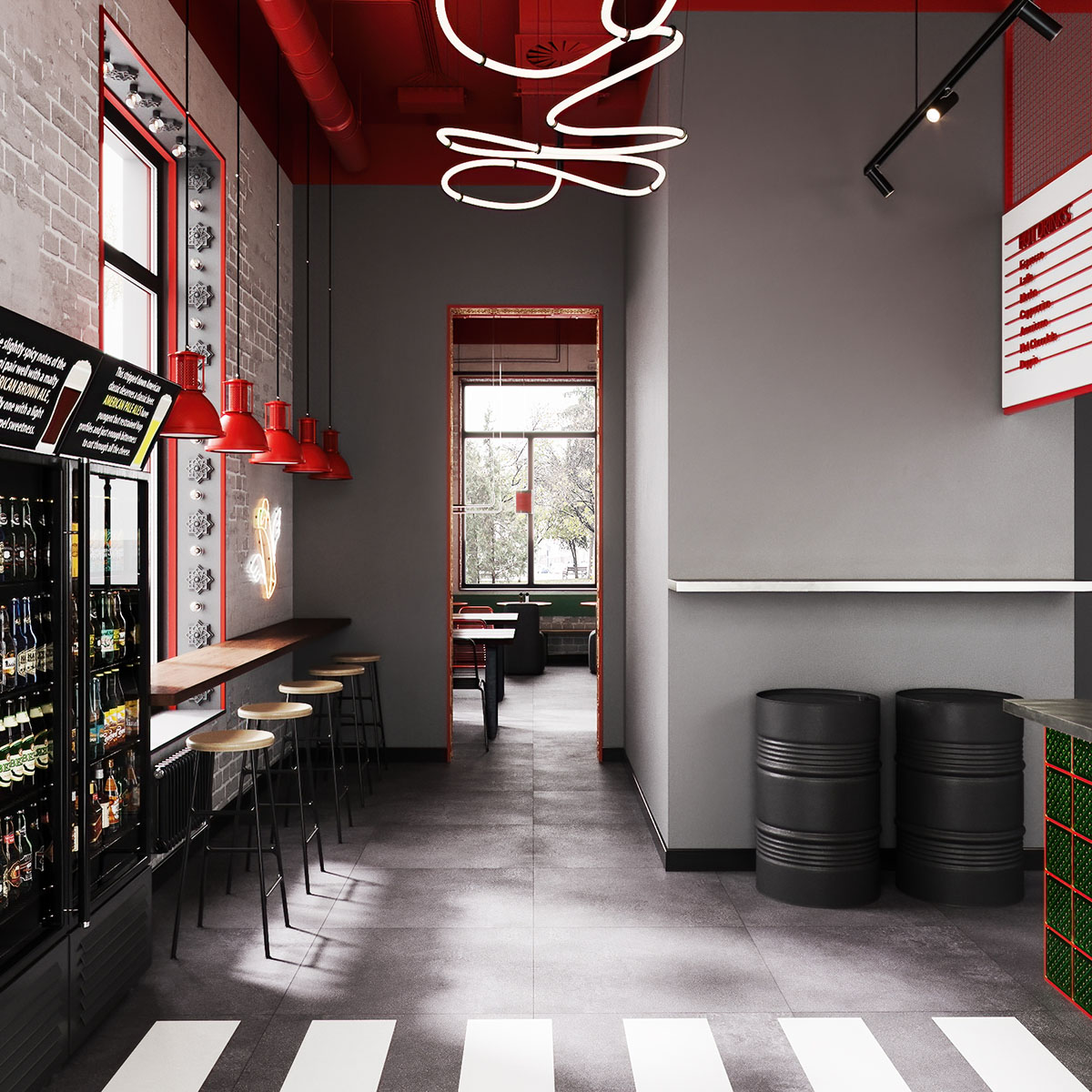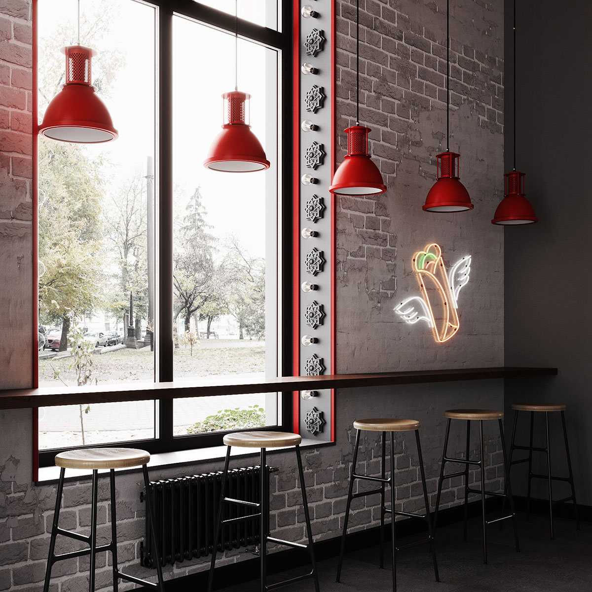Проект ресторана, для оформления которого выбрали обои из коллекции THE SECRET LANGUAGE. Сеть стритфудов Шавармье, Москва. Концепция культуры улиц с лёгким арабским акцентом, ведь шеф-повар араб. Можно было бы заказать граффити, но так как это сеть, то акцентная стена должна быть повторяемой и узнаваемой.