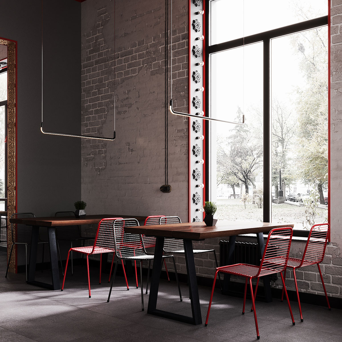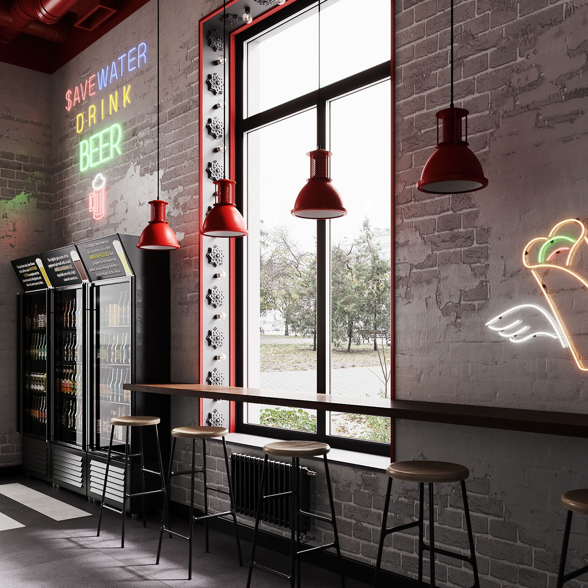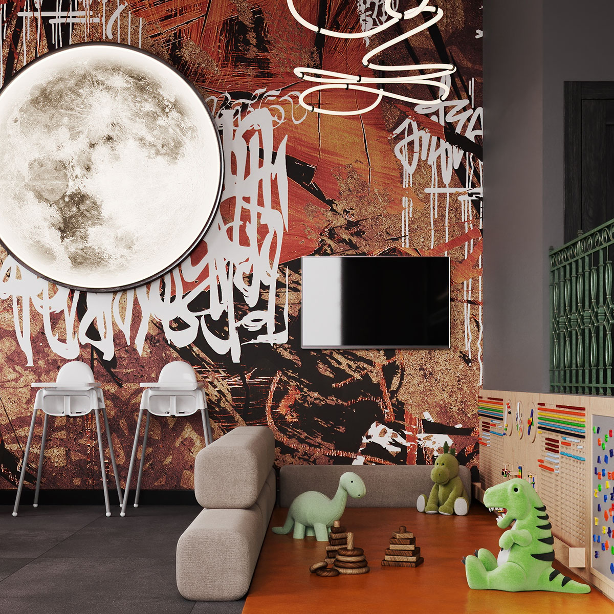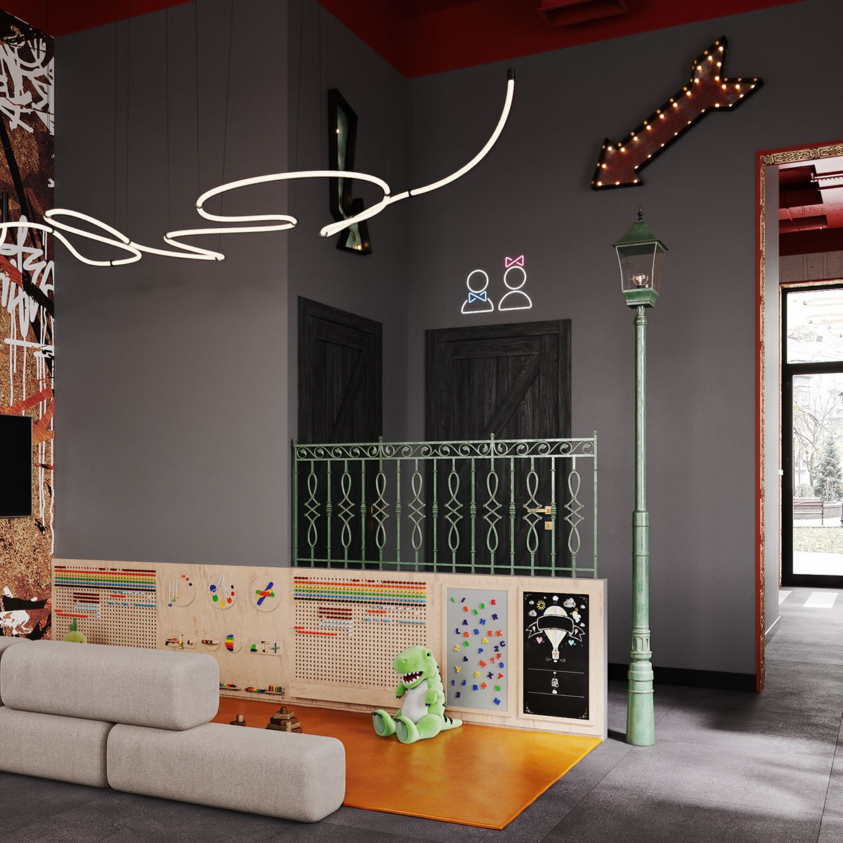 Проект ресторана, для оформления которого выбрали обои из коллекции THE SECRET LANGUAGE. Сеть стритфудов Шавармье, Москва. Концепция культуры улиц с лёгким арабским акцентом, ведь шеф-повар араб. Можно было бы заказать граффити, но так как это сеть, то акцентная стена должна быть повторяемой и узнаваемой.