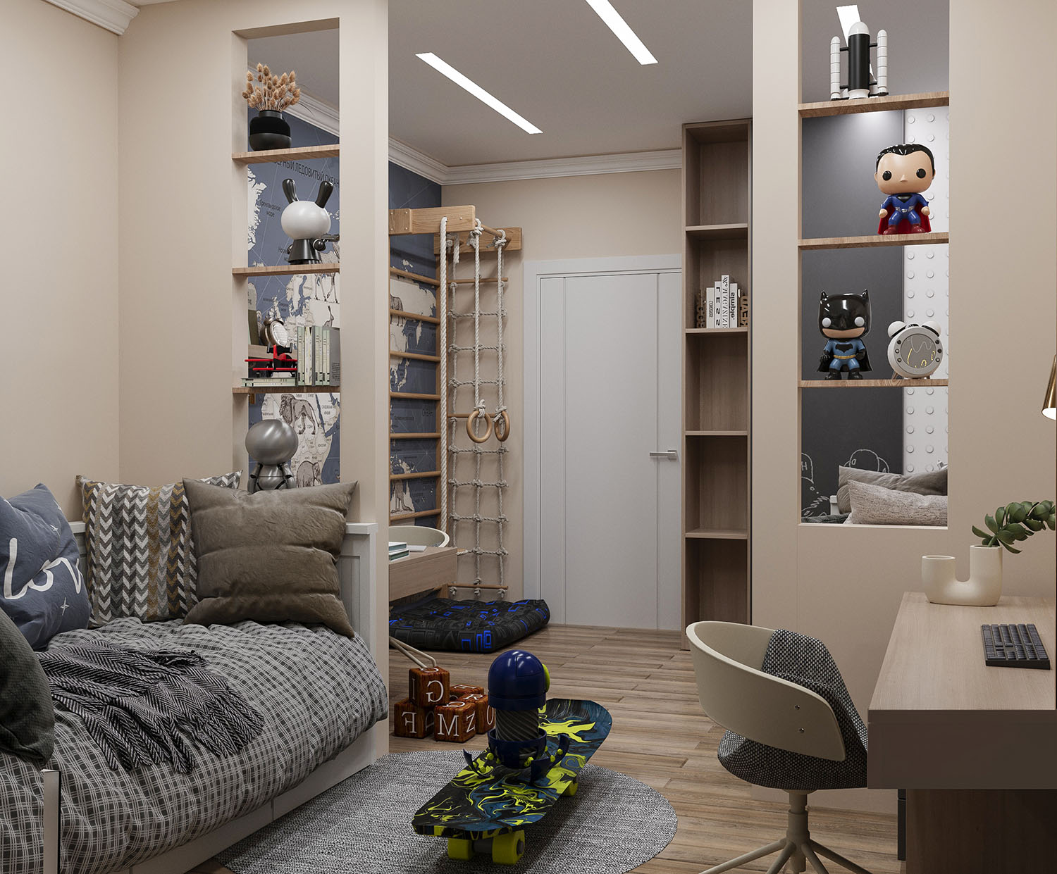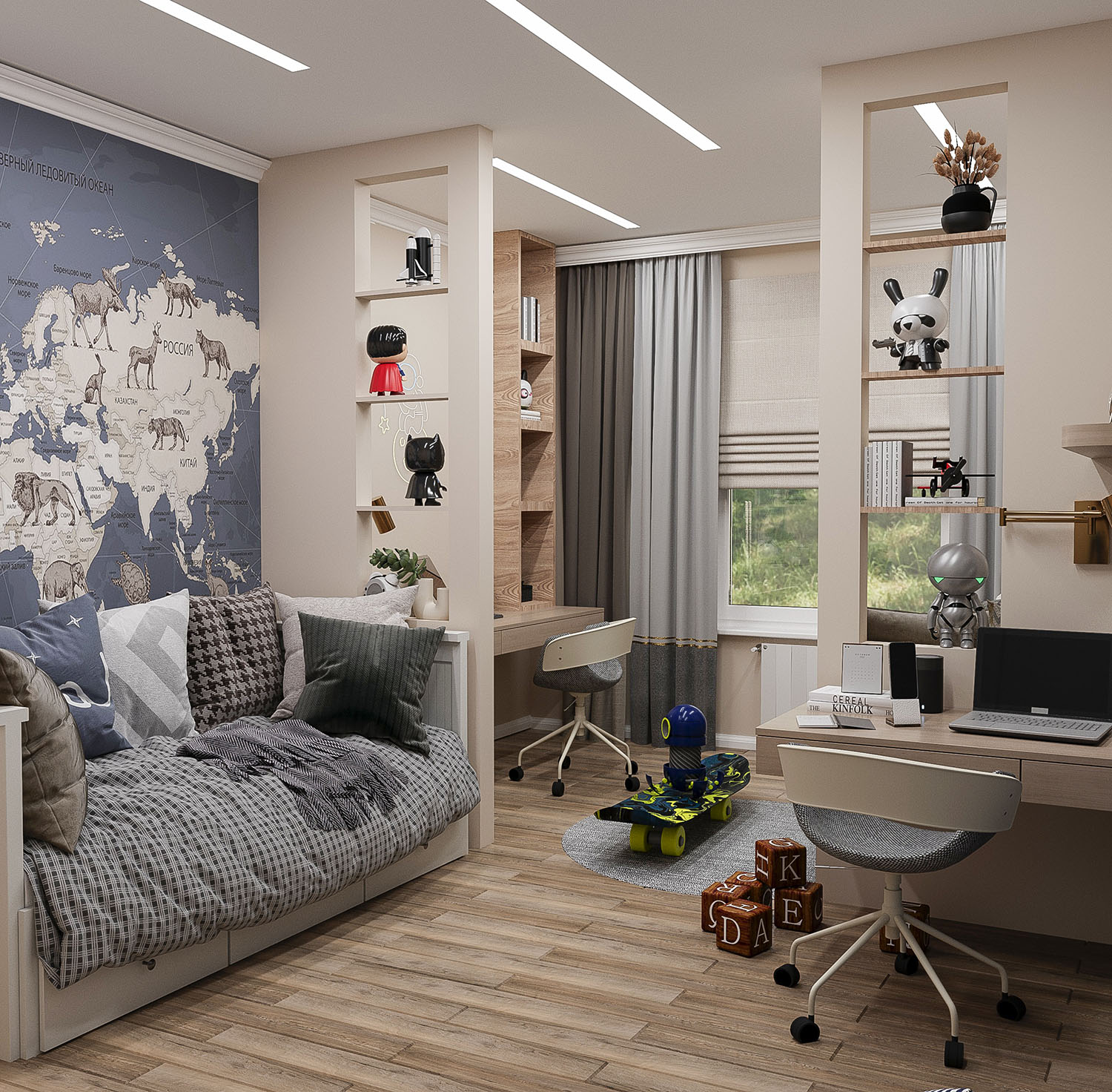 В этой комнате использовались спокойные, но достаточно стильные цвета, такие как тёмно-синий и бежевый, а также такой прием как разграничение пространства перегородками, в нишах которых можно поставить книги или игрушки.