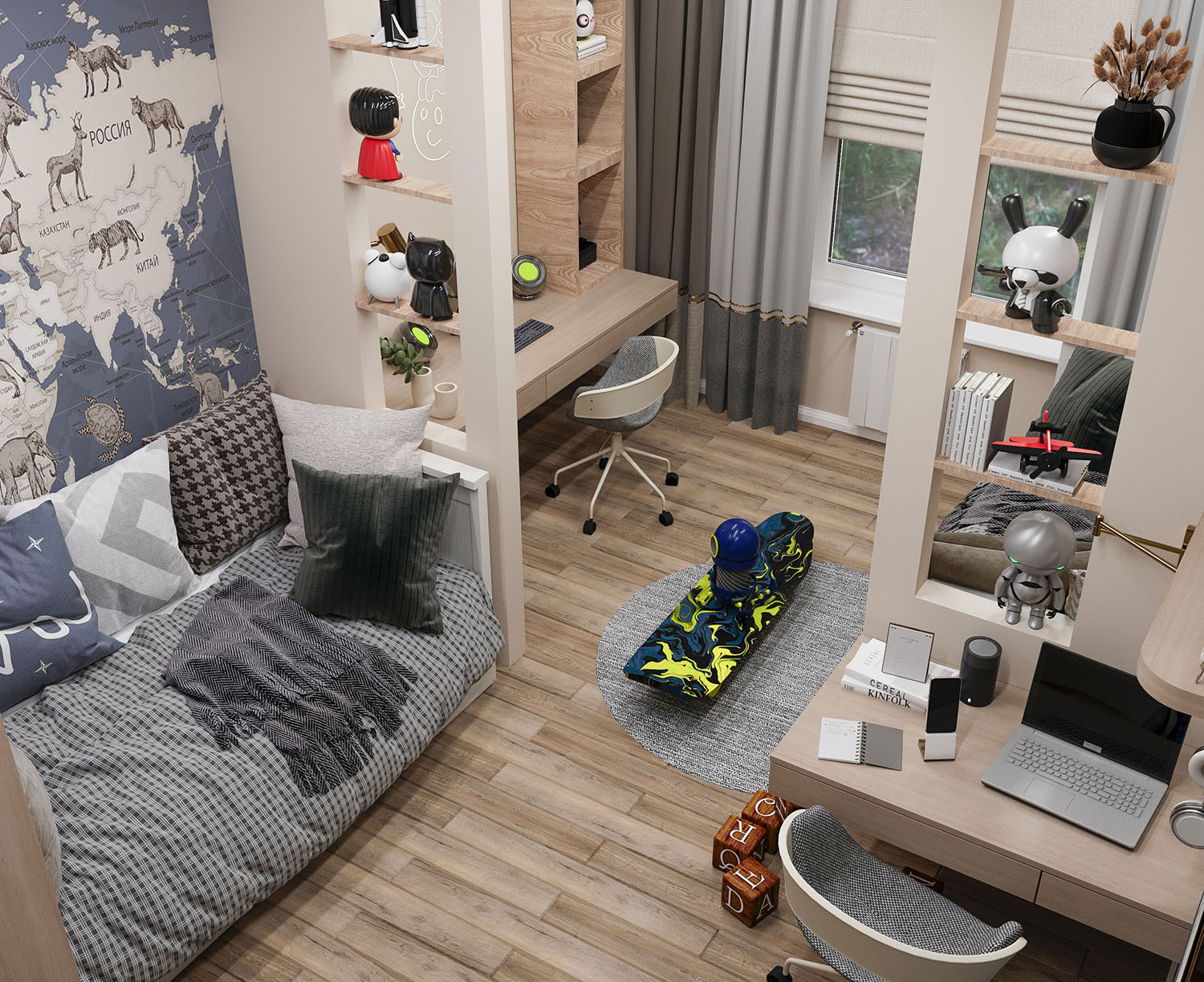 Комната небольшая — 17 м², но достаточно просторная, чтобы разместить все самое необходимое для учёбы и отдыха: отдельные удобные кровати, вместительный шкаф, рабочие столы — место для учёбы, место для игр со шведской стенкой и мягкими пуфиками.