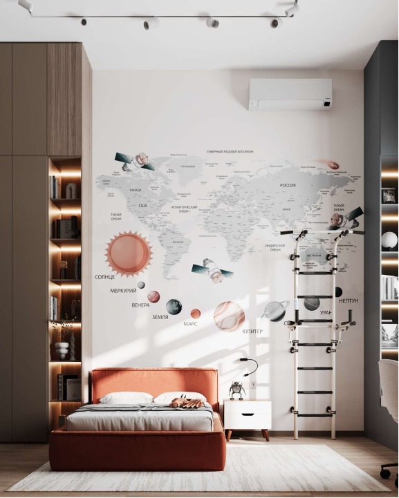 Ребятам постарше подойдет вариант дизайнерских обоев, где на каждой стране карты мира изображен флаг. Учеба может и должна быть интересной! Ведь дети изучают мир непрерывно. Кроме того, на карту можно поместить любимых персонажей малыша – пиратов или космонавтов – а также выйти за пределы планеты и изобразить вокруг карты Солнечную систему, чтобы еще больше развивать кругозор ребенка. На обоях для девочек можно изобразить тропических животных и растения, а также подводный мир океана.