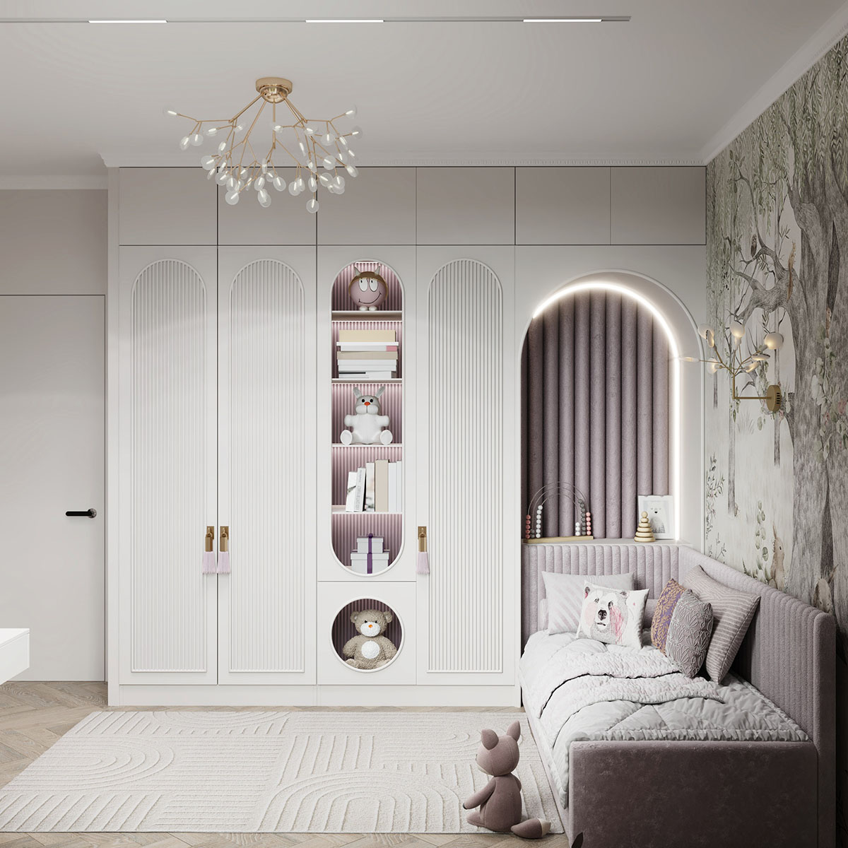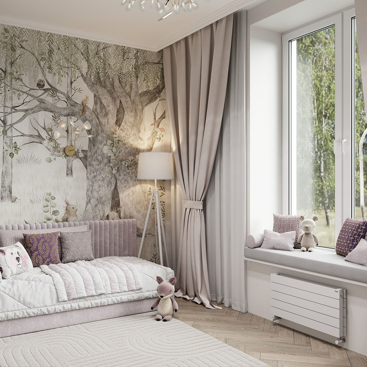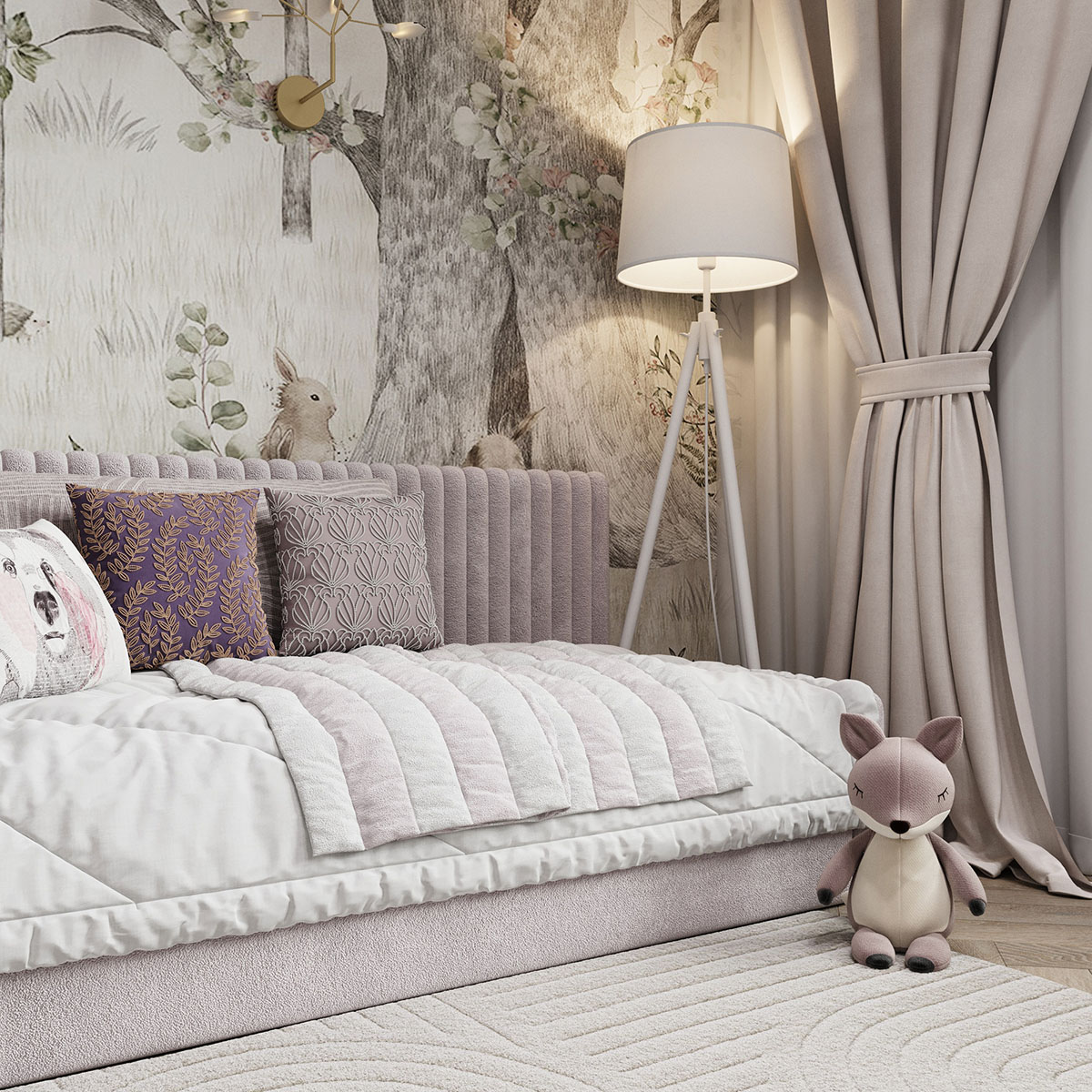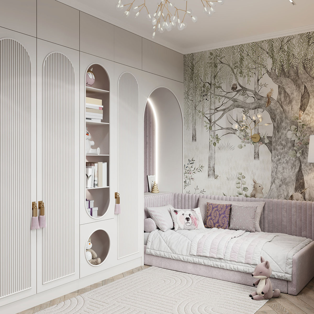 Площадь комнаты небольшая — 13,6 м². Пожеланием клиентов было — создать сказочную атмосферу, где много света и воздуха. В дизайне использовали светлые тона в мебели и в материалах, а также фреску из коллекции Woody. Она напоминает чудесные мотивы волшебной сказки, помогая развивать фантазию ребенка. Получилось тепло и нежно.