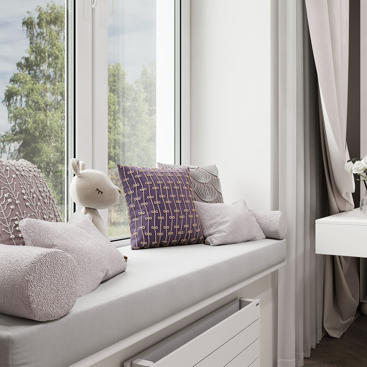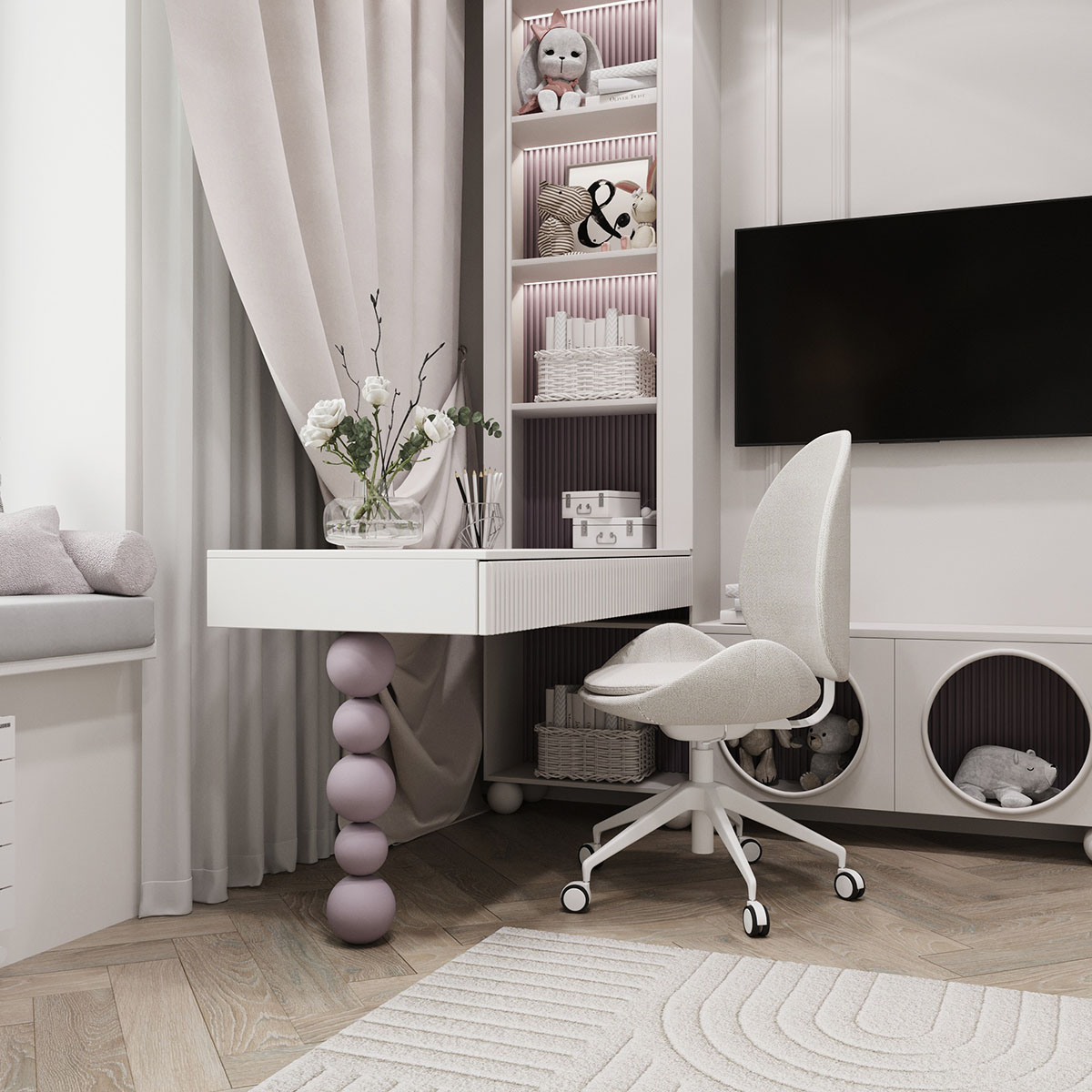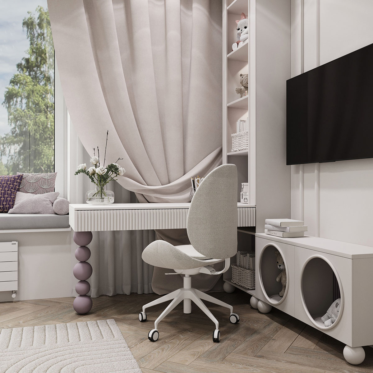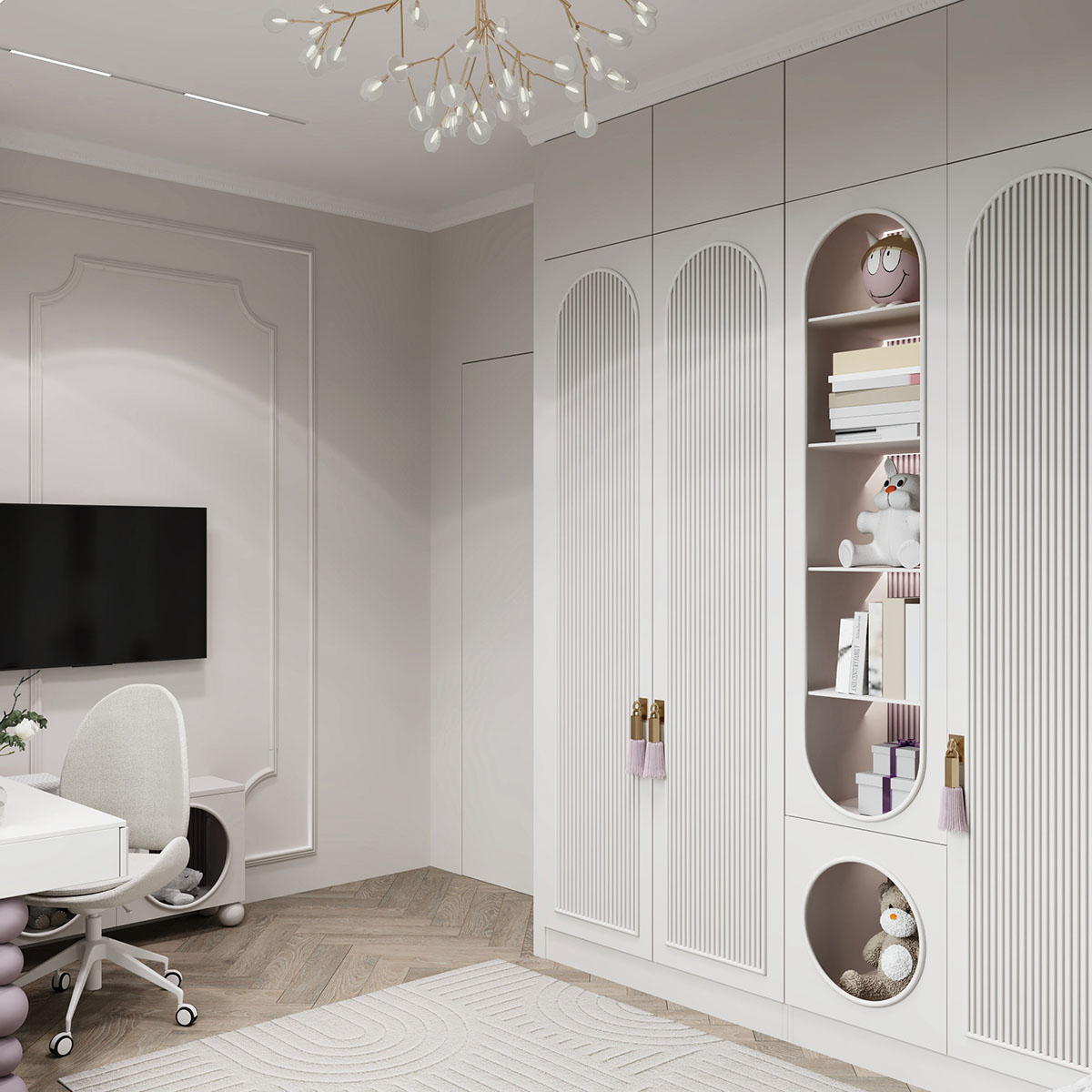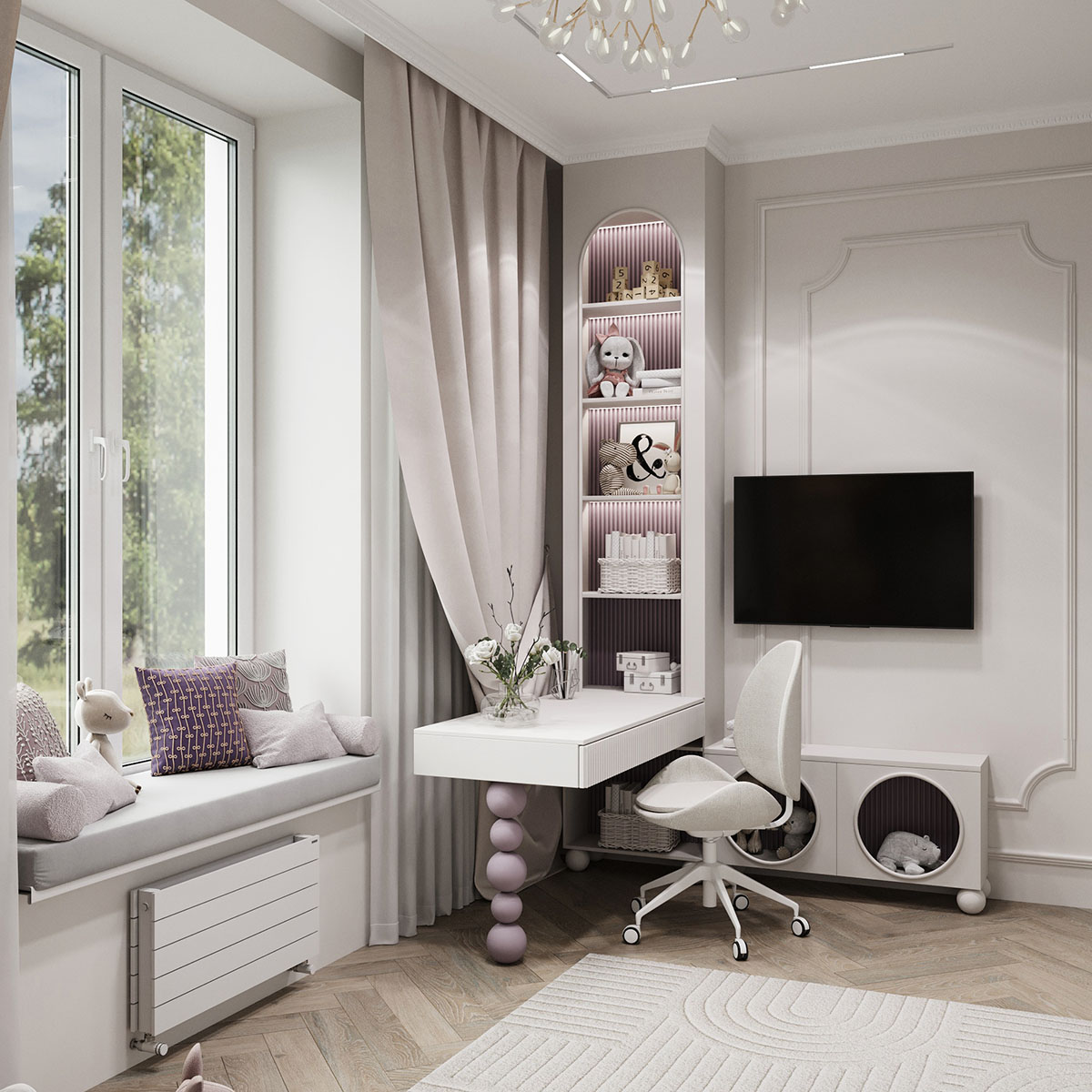 Площадь комнаты небольшая — 13,6 м². Пожеланием клиентов было — создать сказочную атмосферу, где много света и воздуха. В дизайне использовали светлые тона в мебели и в материалах, а также фреску из коллекции Woody. Она напоминает чудесные мотивы волшебной сказки, помогая развивать фантазию ребенка. Получилось тепло и нежно.