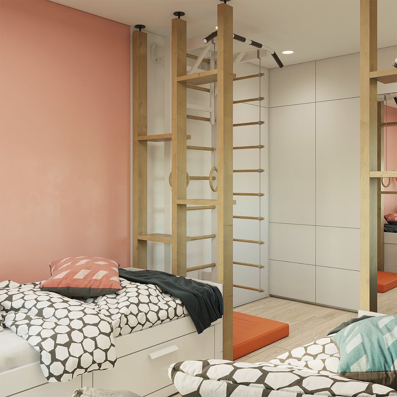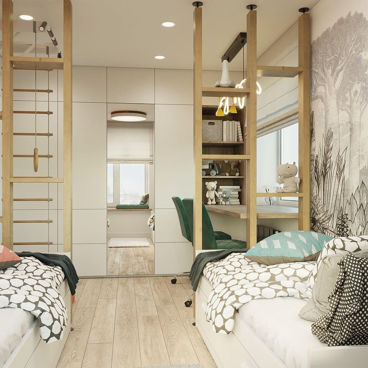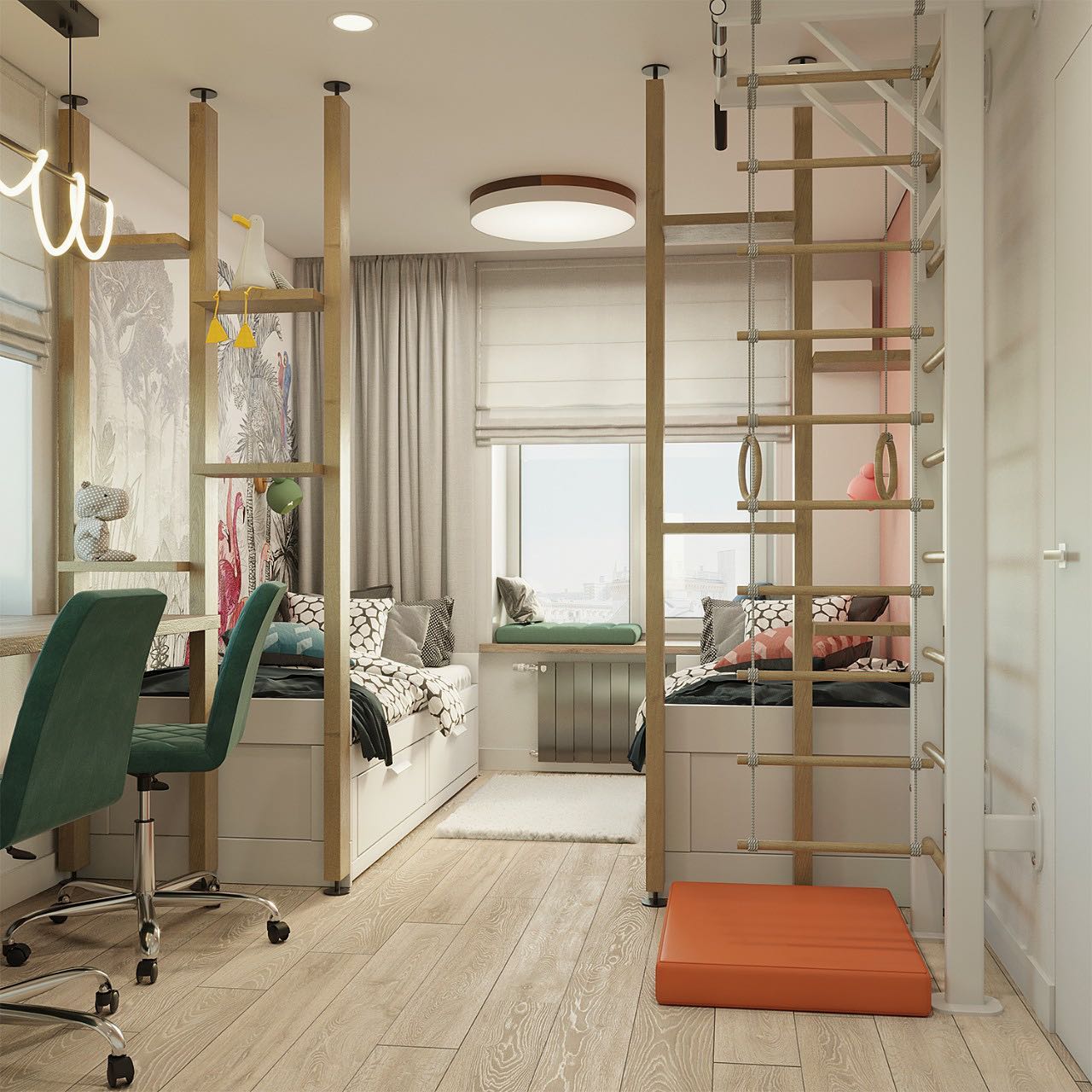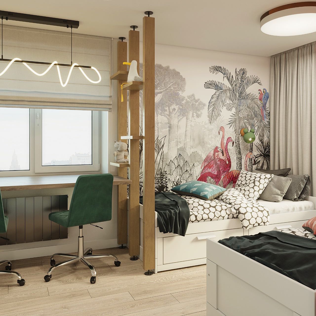 Детская комната для двух девочек. Обои из коллекции ZOO. С ней в детской может развернуться настоящий зоопарк! Яркие розовые фламинго, семейство леопардов и интересующиеся зебры обязательно понравятся юным искателям приключений и откроют детям новый загадочный мир!
