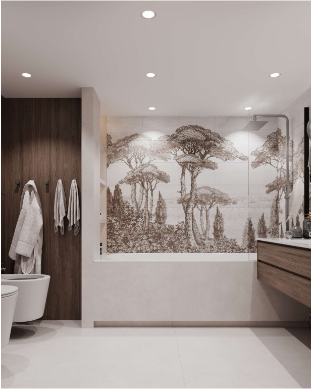 Представляем вам дизайн ванной комнаты с коллекцией необычной плитки «ESTAMPE». Словно скрытые за лёгкой пеленой, её принты напоминают иллюстрации из старинной книги про путешествия. Едва заметные силуэты загадочных растений приглашают задержаться ненадолго в их необычных лесах и отвлечься от привычных забот.