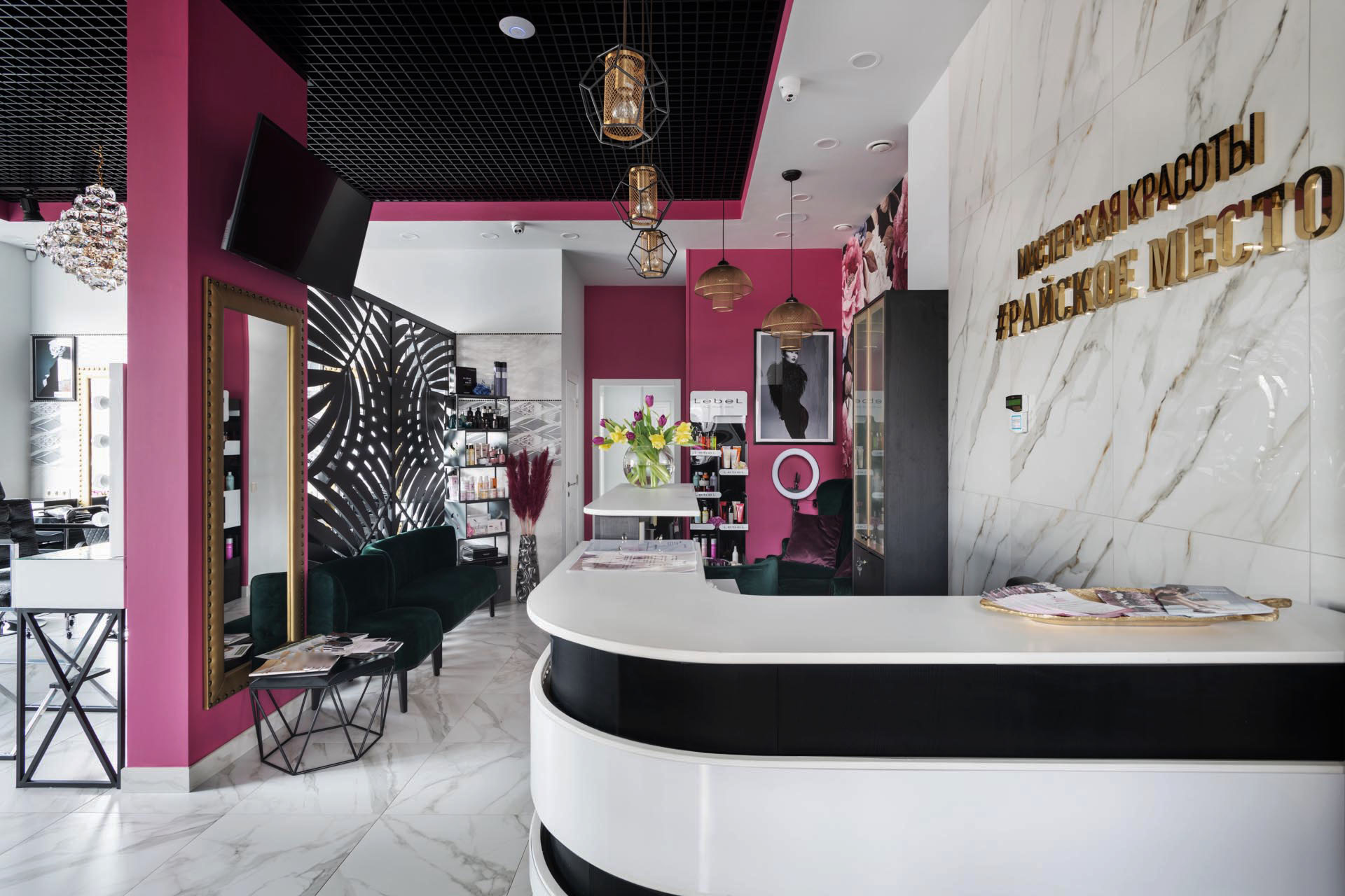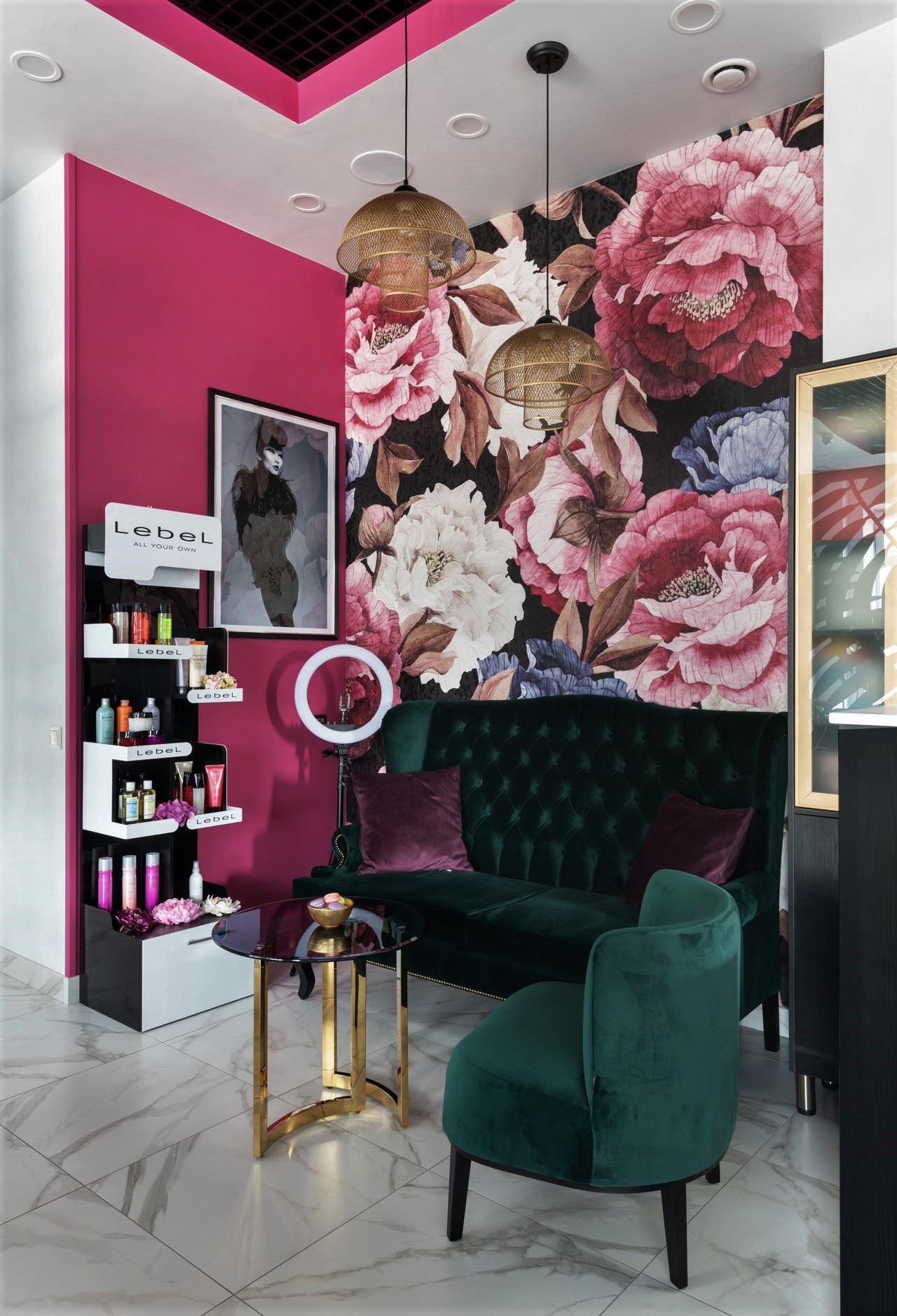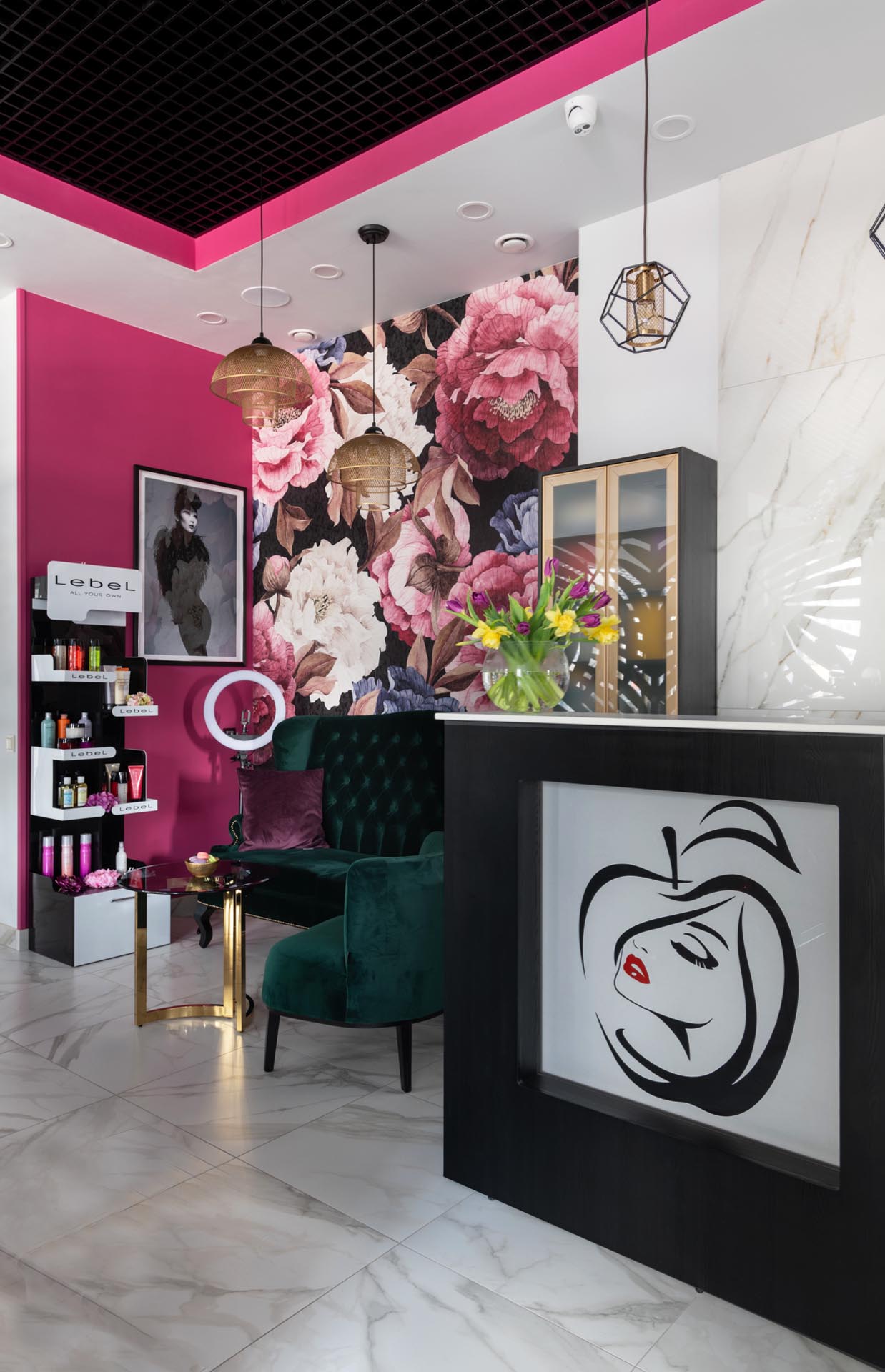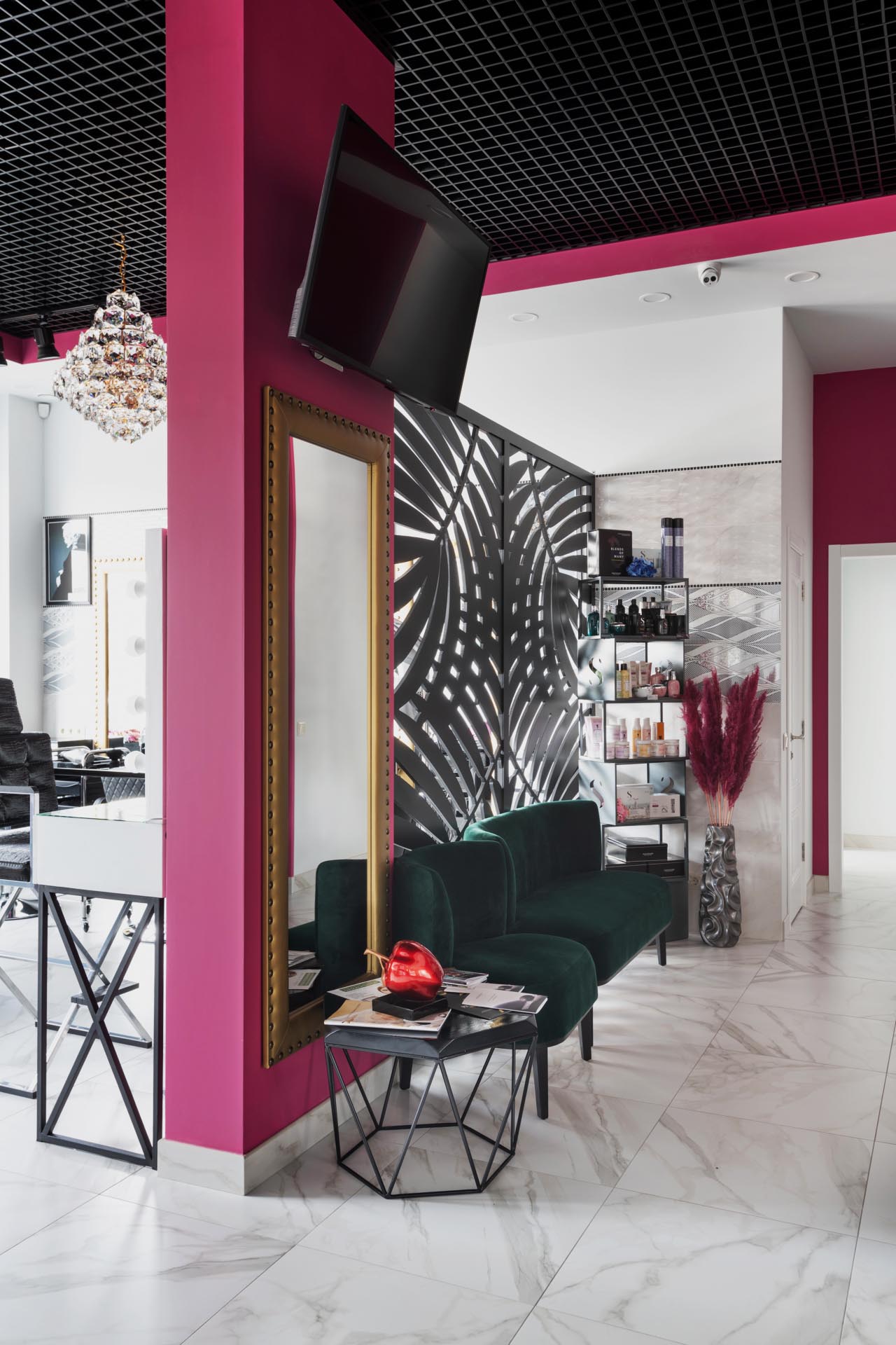 Сложные оттенки бордо, фуксии, пыльно-розового и приглушенного зеленого стали цветовой основой интерьера. Зона ресепшн оформлена широкоформатной плиткой с мраморным теплым рисунком, а резная перегородка с тропическими листьями и небольшим диванчиком отделяет эту зону от парикмахерского зала.