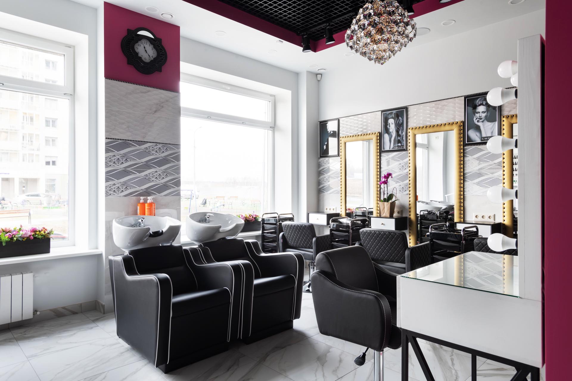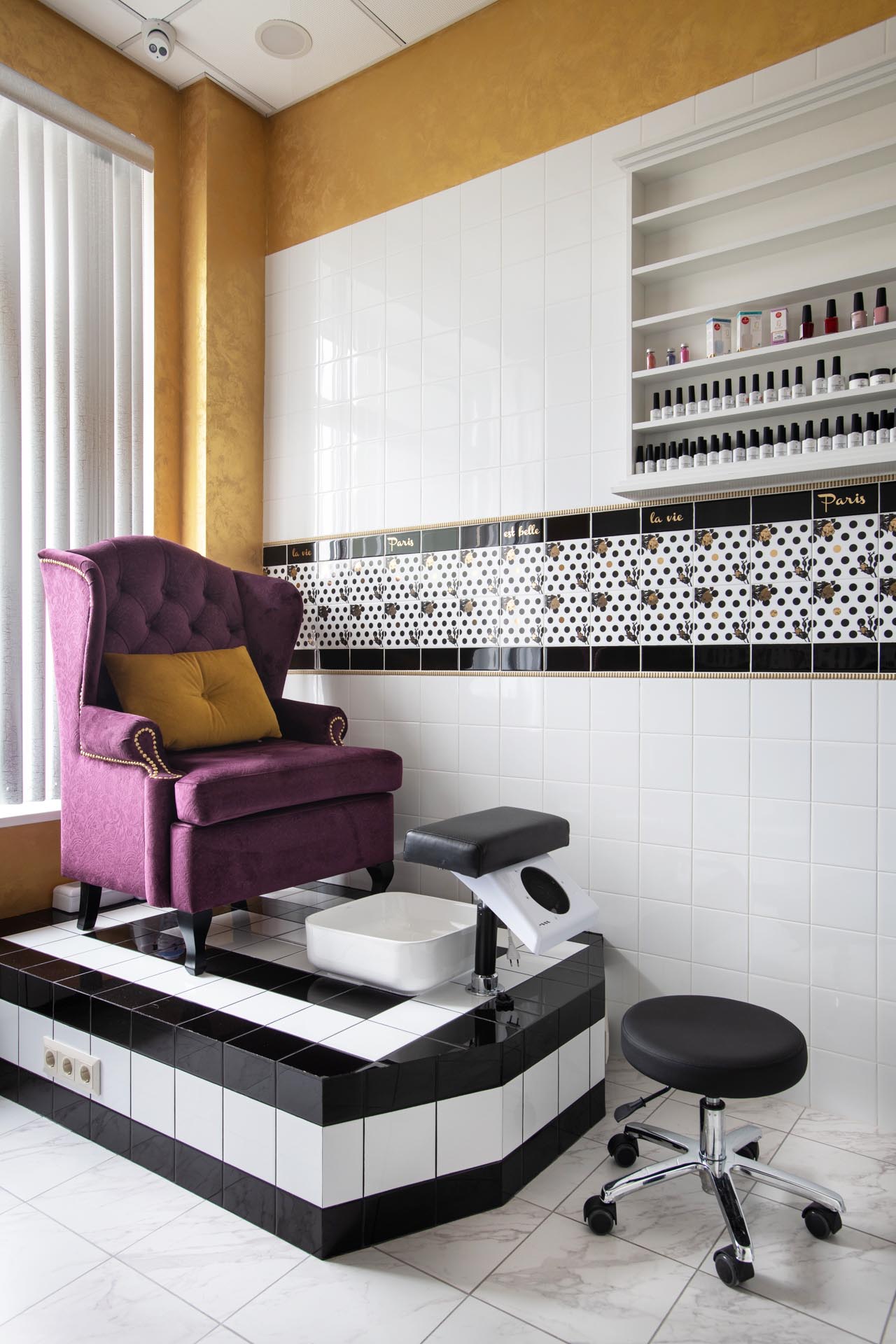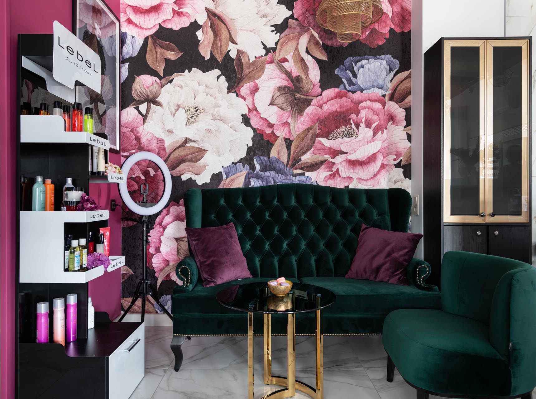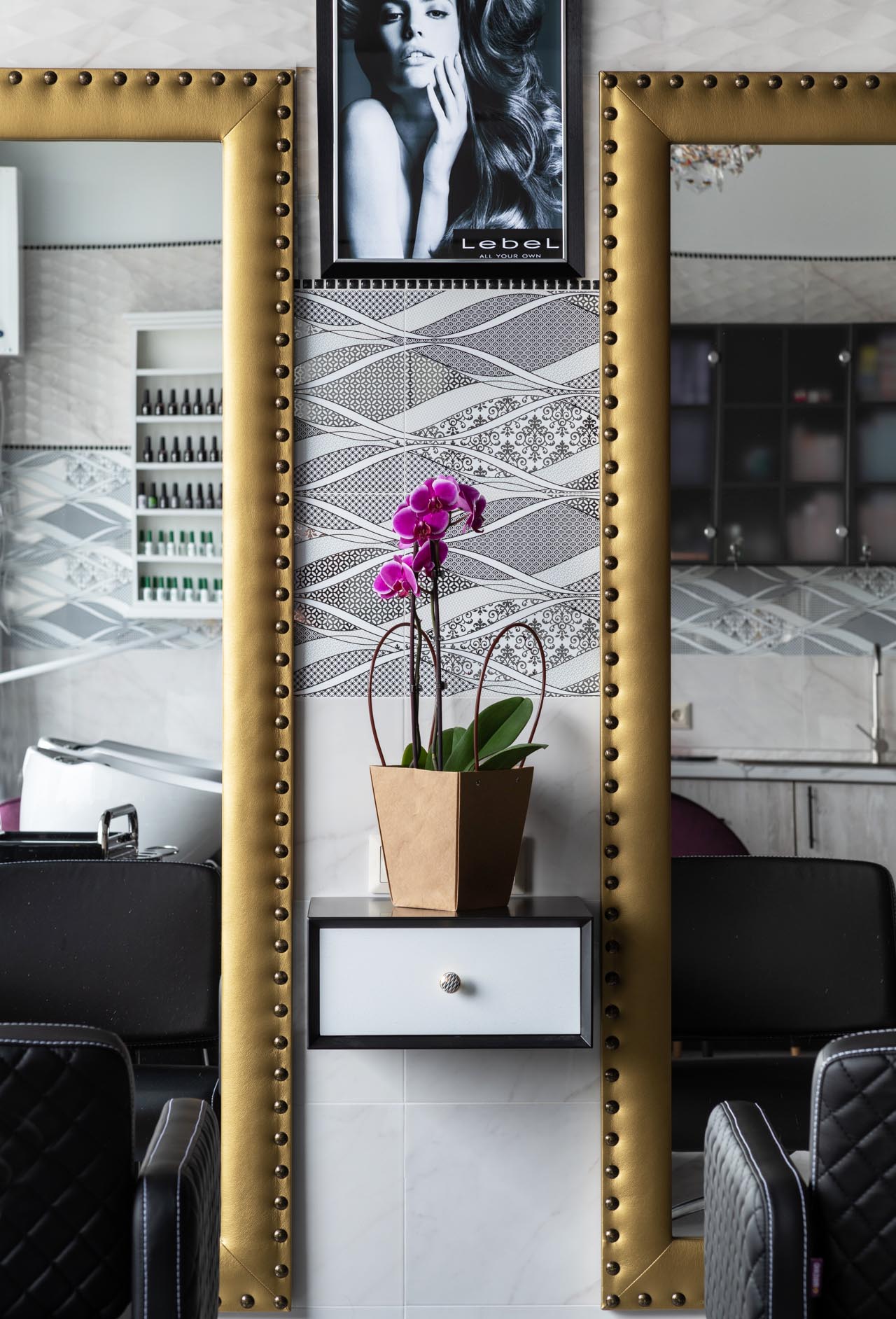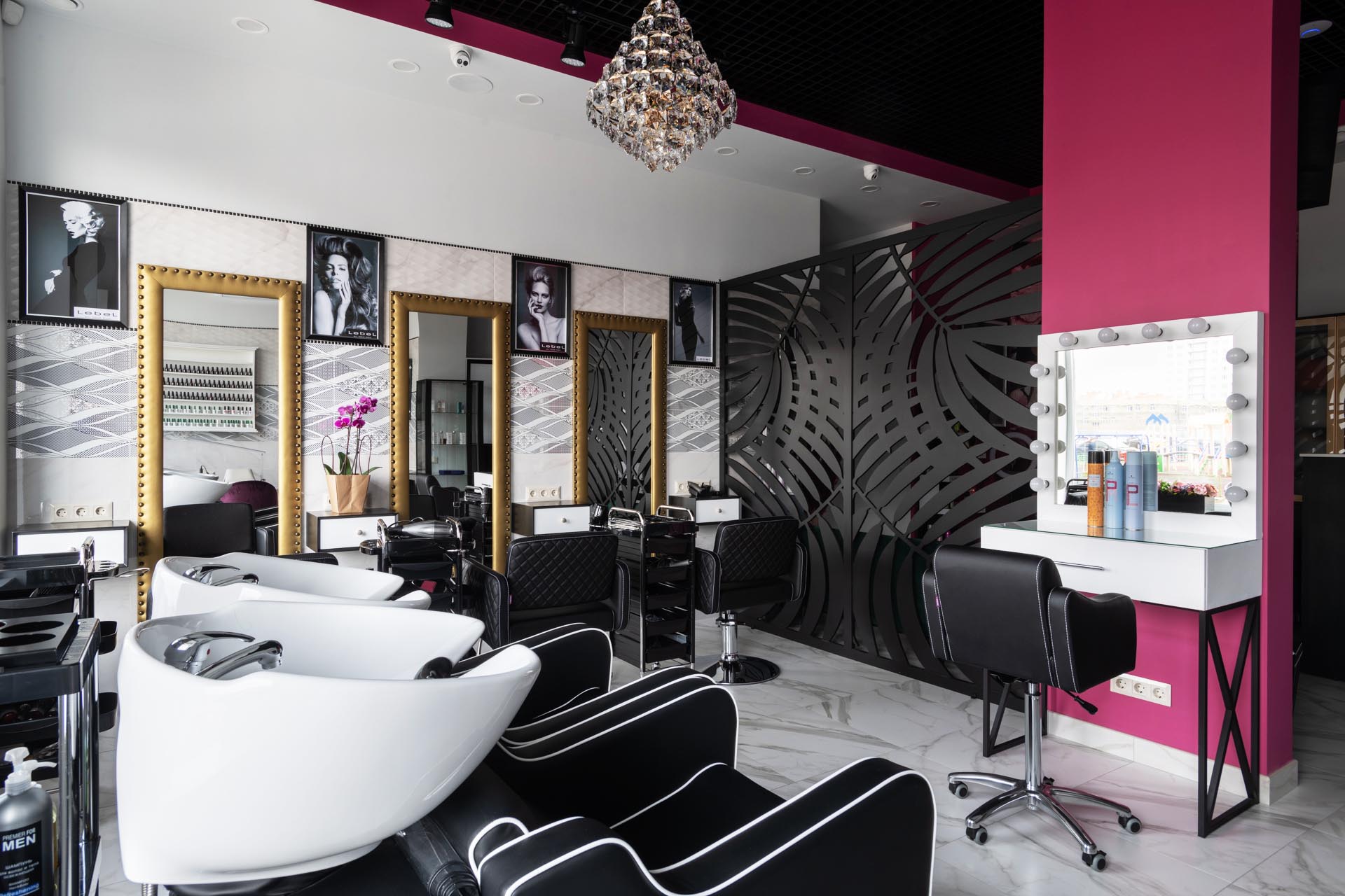 Сложные оттенки бордо, фуксии, пыльно-розового и приглушенного зеленого стали цветовой основой интерьера. Зона ресепшн оформлена широкоформатной плиткой с мраморным теплым рисунком, а резная перегородка с тропическими листьями и небольшим диванчиком отделяет эту зону от парикмахерского зала.