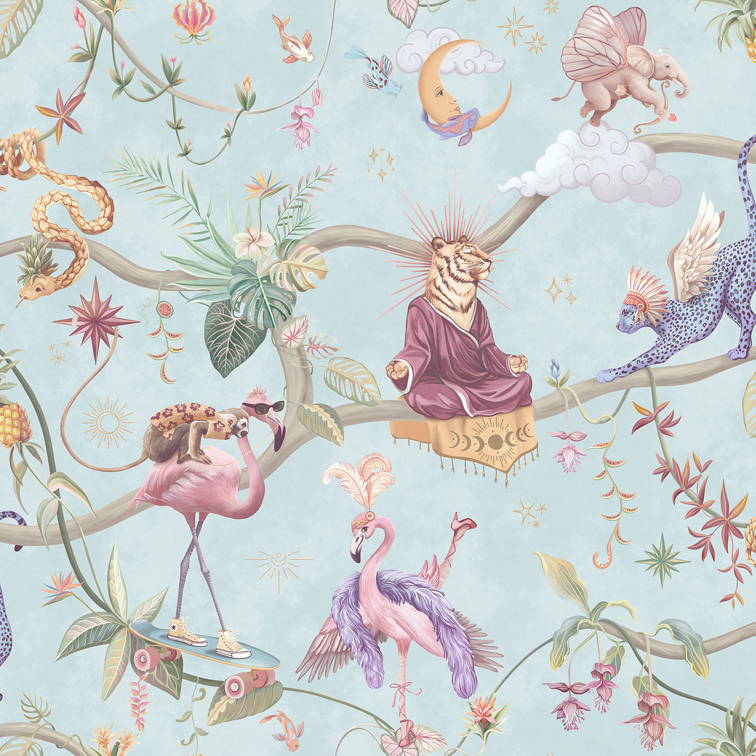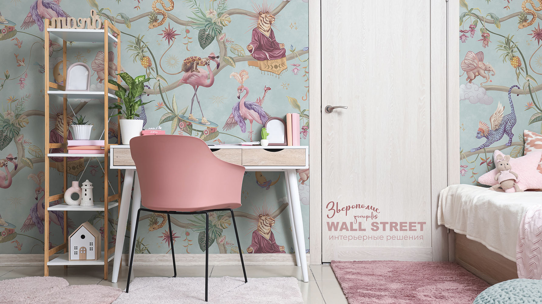 Обои из коллекций Wall Street в трех комнатах: EUPHORIA 22 в гостиной, Zoo в детской комнате, а в спальне Selva