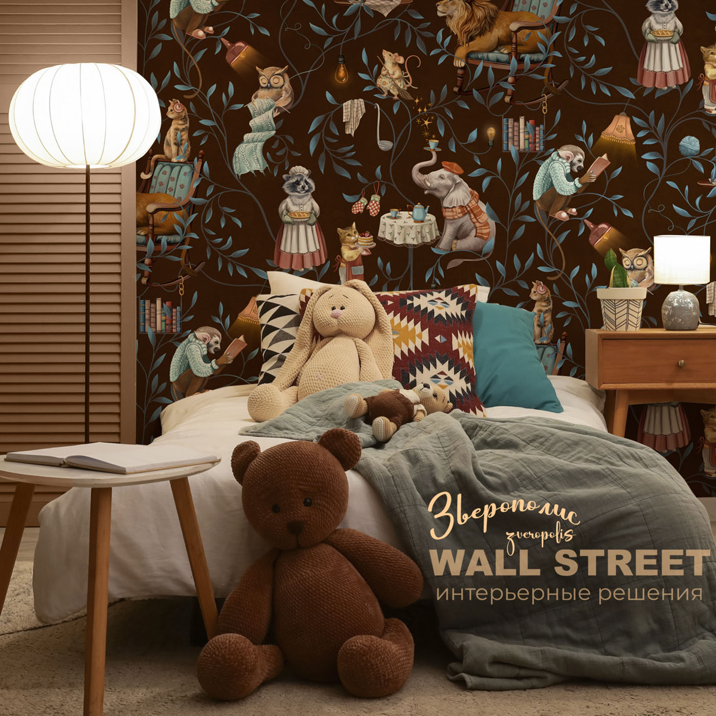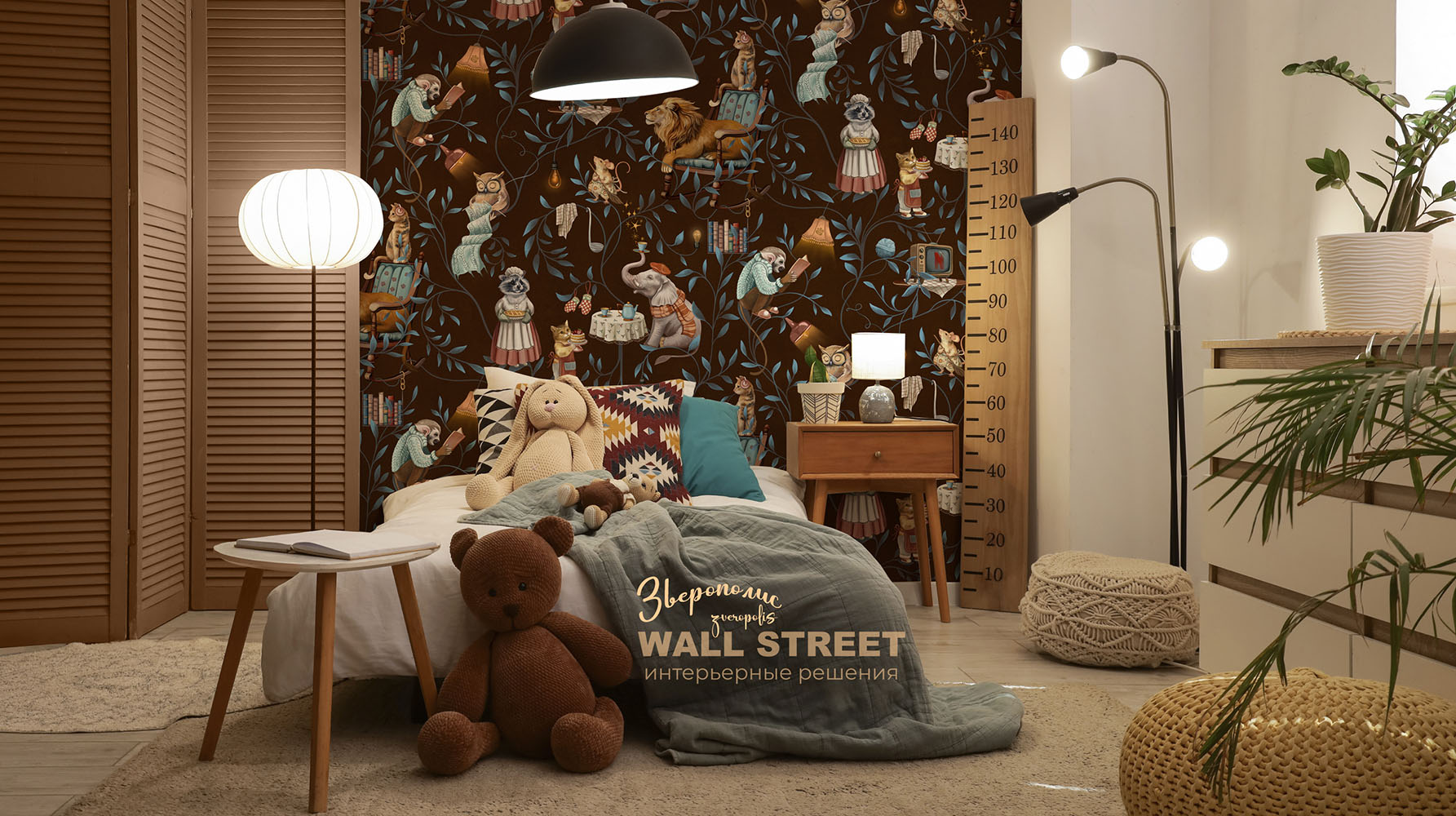 Обои из коллекций Wall Street в трех комнатах: EUPHORIA 22 в гостиной, Zoo в детской комнате, а в спальне Selva