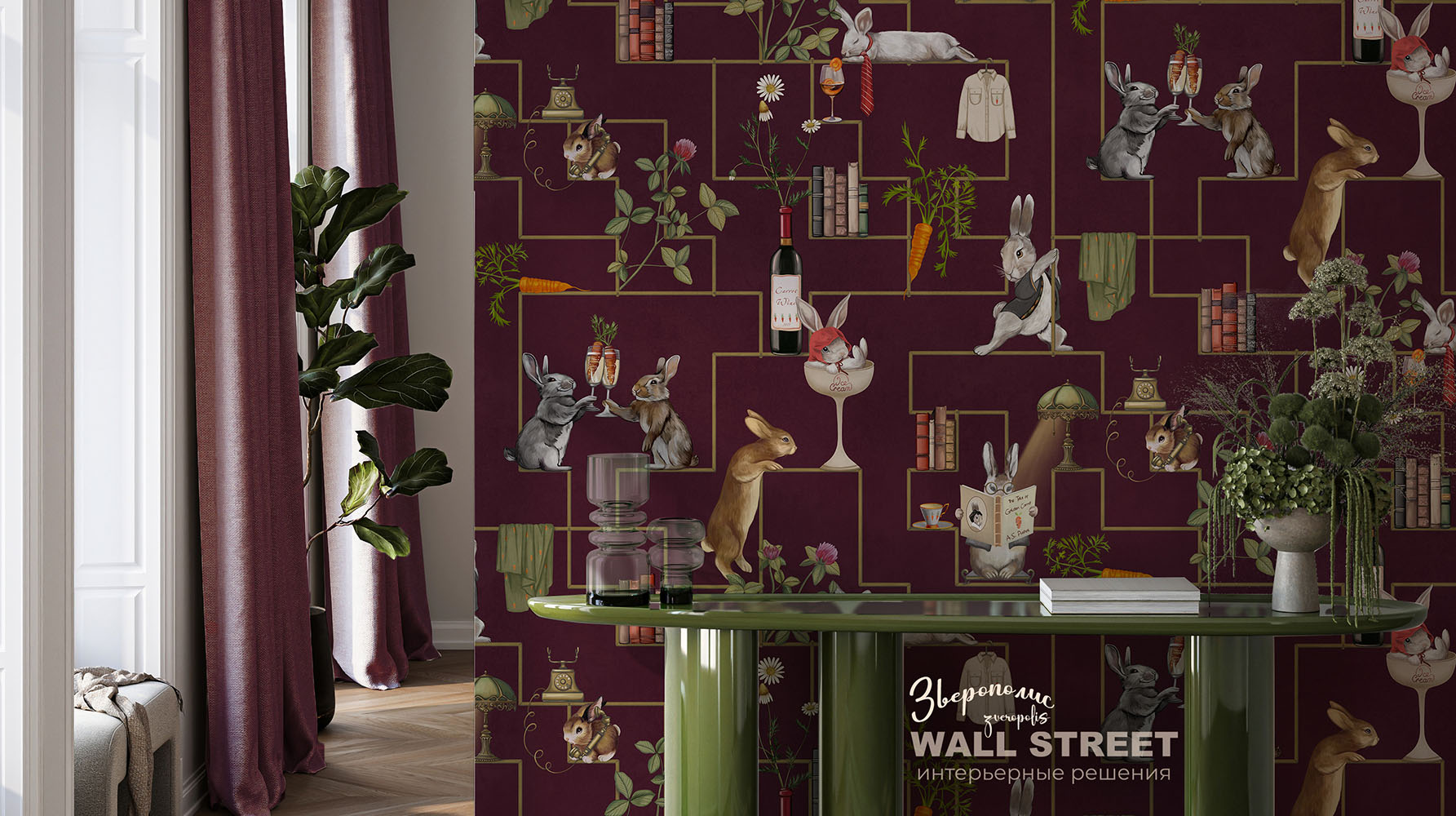 Обои из коллекций Wall Street в трех комнатах: EUPHORIA 22 в гостиной, Zoo в детской комнате, а в спальне Selva